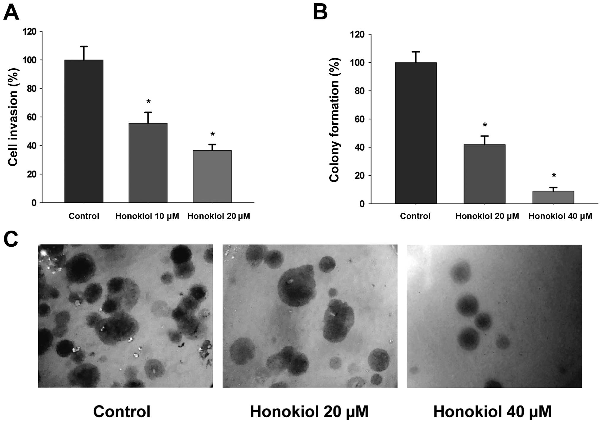 To evaluate whether honokiol (Fig. 1) suppresses invasive behavior of highly metastatic RCC cells, the 786-0 cells were treated with honokiol (0–20 μM) for 24 h and cell invasion was determined as described in Materials and methods. As shown in Fig. 2A, honokiol inhibits cell invasion through Matrigel in a dose-dependent manner. Moreover, honokiol significantly decreases the number of anchorage-independent colonies formed, which is a key step in cancer metastasis (Fig. 2B and C). In summary, honokiol significantly inhibits invasion as well as colony formation of highly meta-static RCC 786-0 cells in a dose-dependent manner.