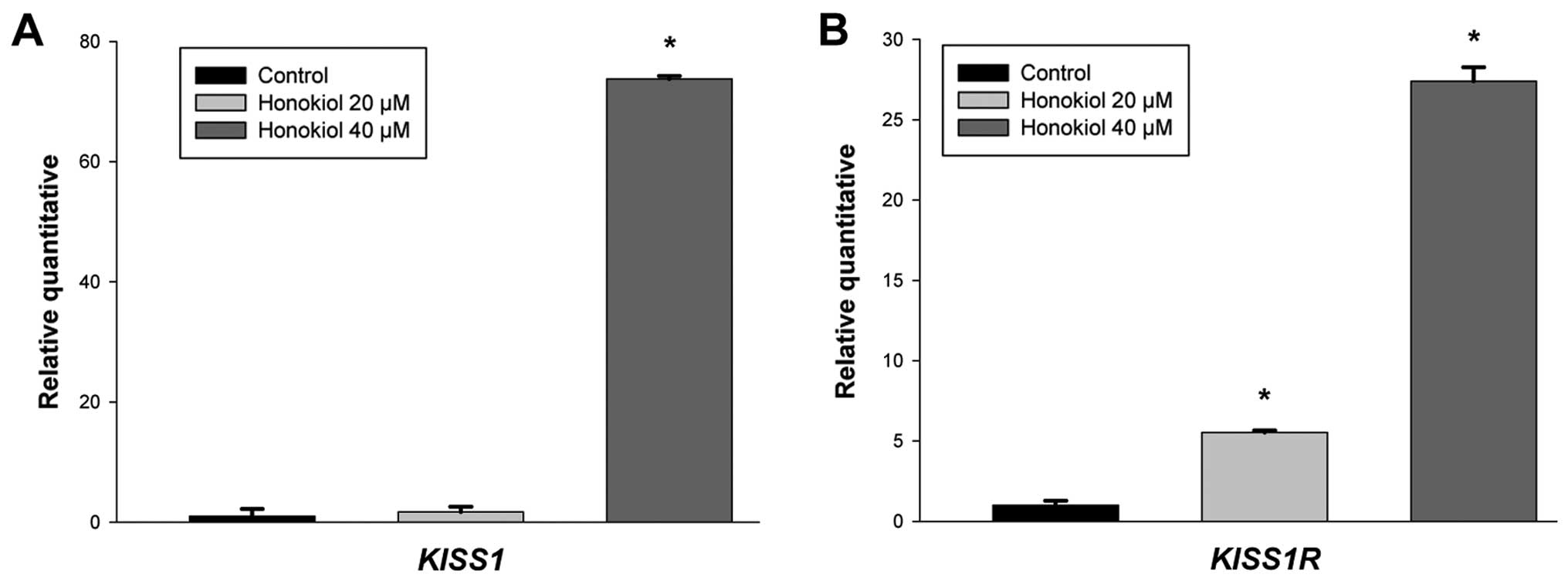 Human RCC cells 786-0 were obtained from ATCC (Manassas, VA, USA). Cancer cells were maintained according to the ATCC procedures. Honokiol (98%) (HonoPure®) was provided by Econugenics Inc. (Santa Rosa, CA, USA) and dissolved in DMSO at a concentration of 80 mM then stored at −20°C. DMSO was purchased from Sigma (St. Louis, MO, USA). Anti-KISS1, anti-KISS1R and anti-β-actin antibodies were obtained from Santa Cruz Biotechnology (Santa Cruz, CA, USA).