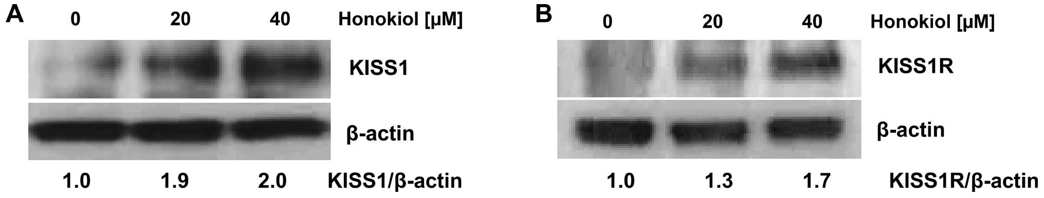 The 786-0 cells were treated with honokiol (0–40 μM) for 24 h. Whole protein extracts isolated from cells were prepared and western blot analysis with KISS1 and KISS1R antibodies were performed as previously described (39). Western blots were quantified with HP-Scanjet 550c and analyzed by UN-SCAN-IT software (Silk Scientific, Orem, UT, USA).