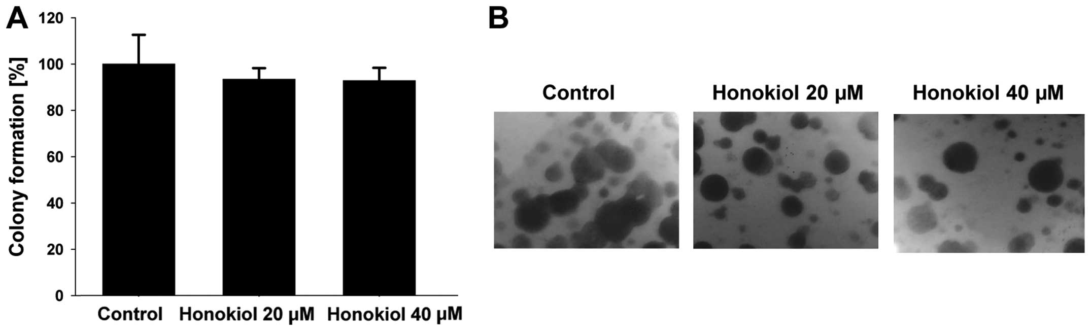 Colony formation of the 786-0 cells incubated in the presence of honokiol (0–40 μM) was evaluated as previously described (36). Data points represent the mean ± SD in one representative experiment repeated at least twice.