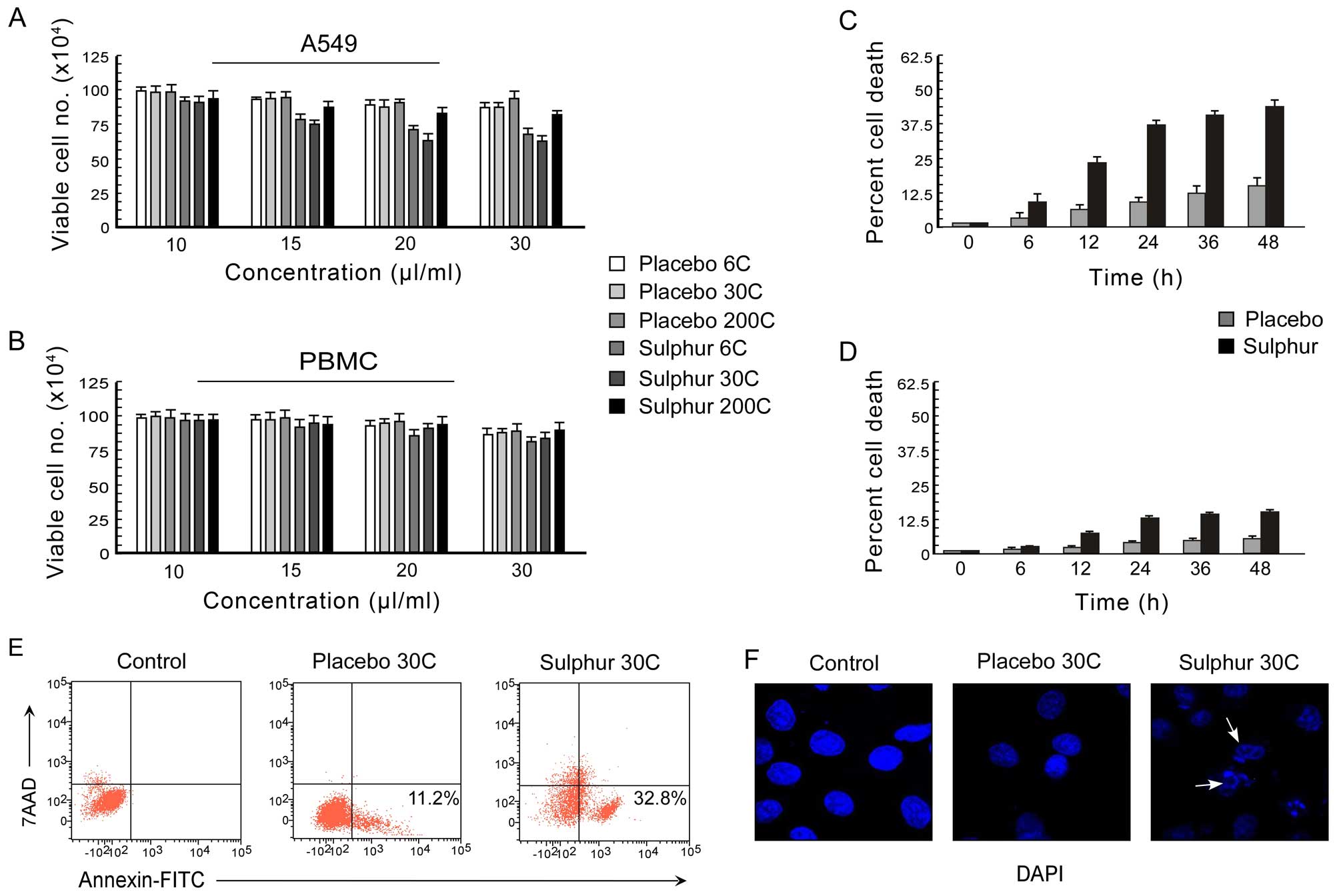 Next, to confirm the nature of cell death as apoptosis, we utilized double labelling techniques using Annexin V-FITC/7-AAD to distinguish between apoptotic and necrotic cells. Our flow cytometric data demonstrated that in comparison to placebo-treated A549 cells, sulphur-treated unfixed A549 cells showed Annexin V-FITC binding with minimum 7-AAD binding (Fig. 1E) indicating that the mode of cell death was apoptosis but not necrosis. These findings were re-confirmed by the development of nuclear blebbing as evidenced by DAPI-stained fluorescent images of sulphur-treated A549 cells (Fig. 1F). These data together supported the notion that sulphur 30C asserts apoptogenic effect in the NSCLC A549 cells.