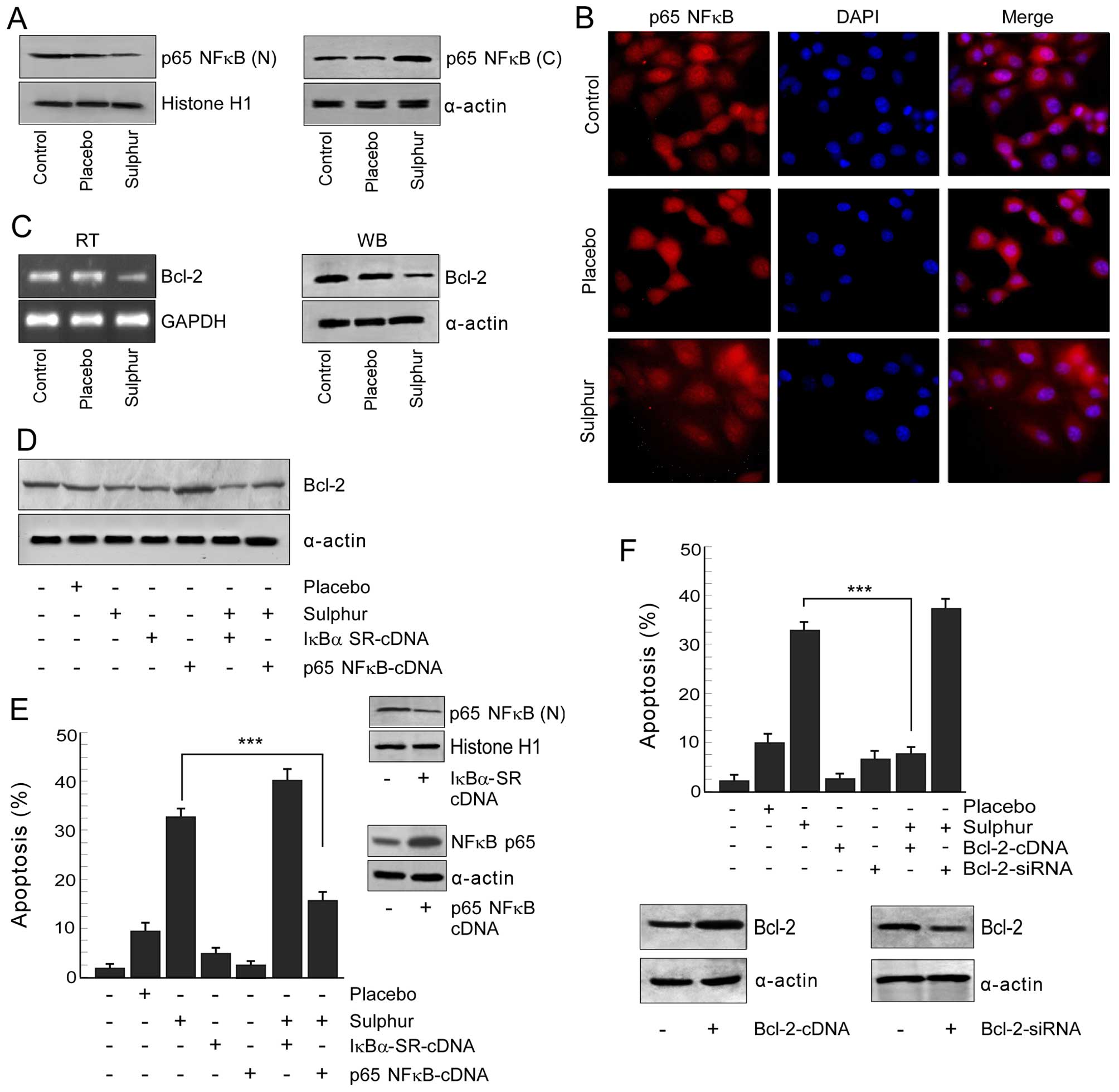 All these results together signified that sulphur by inhibiting p65NFκB-governed survival signalling skewed the cellular microenvironment in favor of p53-transcriptional activation to result in apoptosis.