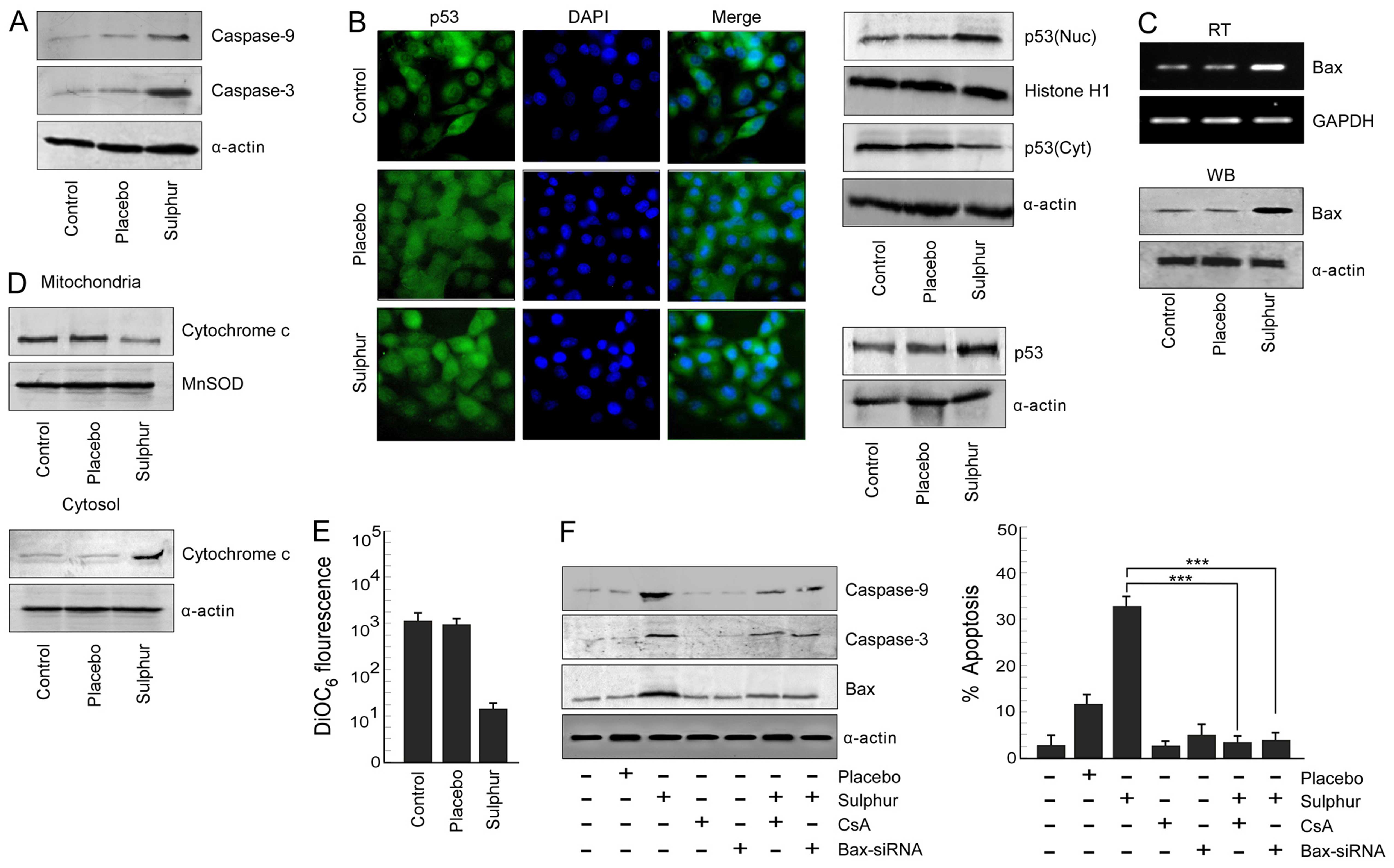 Since inhibition of p65NFκB activity in NSCLC cells induced a powerful apoptotic response, we predicted the involvement of the cellular apoptotic proteins during sulphur-induced apoptosis. We evaluated the status of apoptotic proteases, i.e., caspase-9 and caspase-3, respectively, in response to sulphur treatment. It was noted that sulphur treatment significantly upregulated levels of cleaved caspase-9 and caspase-3 in A549 cells (Fig. 3A). Since tumor suppressor protein p53 plays an important role in canonical apoptotic pathway, the above results tempted us to compare the p53 activation status upon sulphur exposure in NSCLC cells. Results of Fig. 3B left panel revealed that sulphur induced p53 expression in A549 cells when compared to untreated cells. These results were further confirmed by confocal microscopy, the results of which not only demonstrated accumulation of p53 protein but also its translocation from cytosol to nucleus of sulphur-exposed A549 cells (Fig. 3B, middle panel). Furthermore, findings of western blot analysis verified greater translocation of p53 from cytosol to nucleus upon sulphur exposure in A549 cells (Fig. 3B right panel). It is acknowledged that p53 when localized in nucleus transactivates its downstream target genes (31). We, therefore, next assessed the status of its trans-activated gene product, i.e., Bax, by western blot and RT-PCR analyses in sulphur-treated and untreated A549 cells. Our results re-established that in comparison to un-/placebo-treated tumor cells, sulphur-exposed cells showed increase in the levels of p53 trans-activated gene product Bax (Fig. 3C) Downstream of Bax, increase in cytosolic cytochrome c with its concomitant decrease in mitochondria (Fig. 3D) were observed and also significant mitochondrial transmembrane potential (MTP) loss is observed in sulphur-exposed A549 cells as compared to control and placebo-treated A549 cells (Fig. 3E).