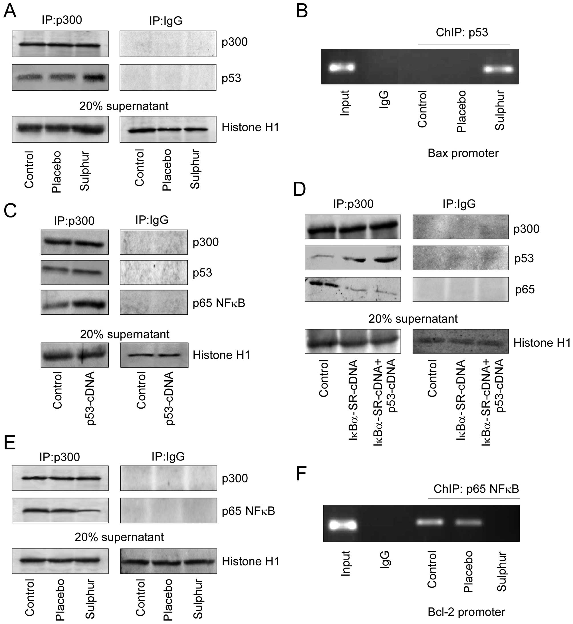We next attempted to unveil the detail mechanisms underlying NFκB-mediated inhibition of p53 transcription functions. Recent studies indicate that the transcriptional activity of p53 is regulated by its interaction with the transcriptional co-activator p300 (27,31). To verify the effects of sulphur on p53–p300 cross-talk, if any, we immunoprecipitated nuclear p300 in NSCLC cells treated with placebo, or sulphur and verified its interaction with p53 by western blotting. It was observed that in contrast to placebo, sulphur induced p53–p300 interaction (Fig. 5A). Consistently, it was further observed by ChIP analysis that sulphur treatment in NSCLC cells enhanced p53 binding on Bax promoter, which is a pre-requisite for transcriptional activation of Bax (Fig. 5B). This subsequently enabled p53-dependent apoptosis as observed earlier (Fig. 3A). Since, sulphur triggered p53–p300 interaction in cells where p65NFκB activation was not taking place, we proposed that nuclear translocation of p65NFκB in untreated p53-cDNA transfected A549 cells might have sequestered p300 thereby abridging p53–p300 cross-talk. As anticipated, these untreated p53-cDNA transfected A549 cells manifested significant p65NFκB-bound p300 in their nuclear lysates (Fig. 5C). Furthermore, upon genetically perturbing nuclear translocation of p65NFκB in these p53-cDNA trasfected A549 cells, significant increase in p53–p300 interaction was observed with concomitant decrease in p65NFκB-bound p300 (Fig. 5D). Interestingly sulphur treatment inhibited p65NFκB-p300 cross-talk (Fig. 5E) thereby preventing p65NFκB binding on Bcl-2 promoter to initiate p65NFκB-mediated Bcl-2 transcription (Fig. 5F). These results indicate a competition between NFκB and p53 for availing p300, and depending on the relative availability, the winner, and the fate of the cells are decided.