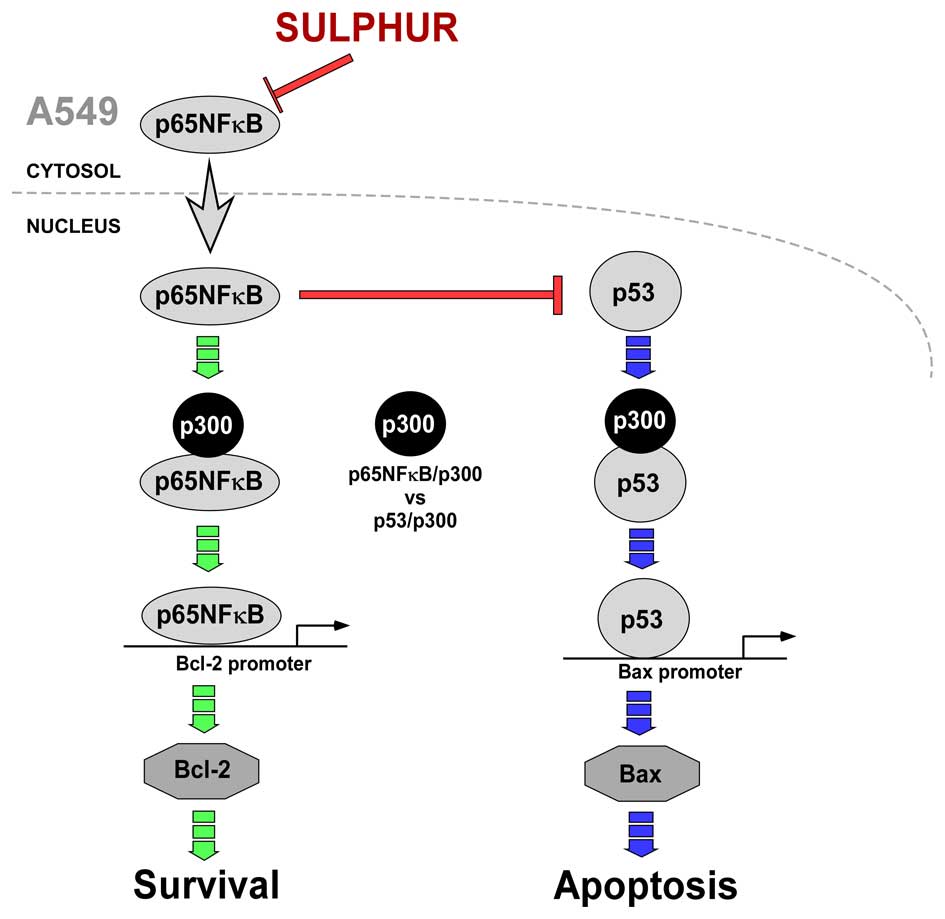 In summary, the above results conclude that in drug-resistant NSCLC cells, p65NFκB competes with p53 for the transcriptional co-activator p300 thereby inhibiting the apoptotic program and upregulates the survival-machinery of the cell. On the other hand, by inhibiting p65NFκB, sulphur censored the survival pathway thereby making p300 available for p53 interaction to ensure the transcription of pro-apoptotic protein Bax for effective induction of apoptosis in otherwise resistant NSCLC cells (Fig. 6).