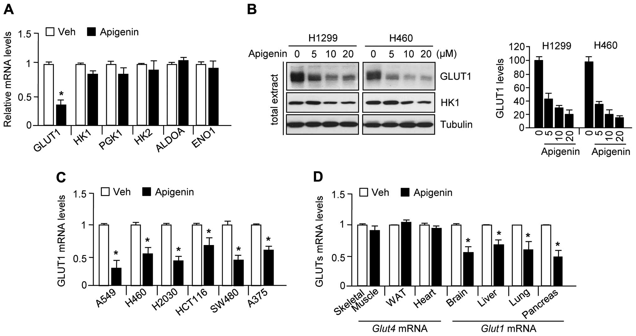 Because it has been reported that apigenin exerts an anticancer effect through suppression of GLUT1 expression (22–25), we examined whether apigenin also downregulates gene expression related to glycolysis, including GLUT1, HK1, PGK1, HK2, ALDOA, and ENO1. The results were consistent with those of previous reports (22–25) that apigenin significantly decreased GLUT1 mRNA (Fig. 1A) and protein (Fig. 1B) levels, but did not decrease the levels of other glycolytic enzymes in H1299 or H460 lung carcinoma cells. In addition, GLUT1 mRNA levels were also decreased by apigenin treatment in other cancer cell lines, including A549 (lung carcinoma), H460 (lung carcinoma), H2030 (lung adenocarcinoma), HCT116 (colorectal carcinoma), SW480 (colorectal adenocarcinoma), and A375 (melanoma) (Fig. 1C). To elucidate whether apigenin suppresses GLUT1 expression in mice, we measured GLUT1 and GLUT4 expression levels in skeletal muscle, white adipose tissue, the heart, brain, liver, lung, and pancreas obtained from apigenin-treated mice. Fig. 1D shows that apigenin significantly suppressed GLUT1 but not GLUT4 expression in the brain, liver, lung, and pancreas. These results indicate that apigenin decreases GLUT1 mRNA and protein levels in various human cancer cell lines, and in mice. All experiments were performed according to the guidelines of the Animal Care and Use Committee, Konkuk University, Korea.