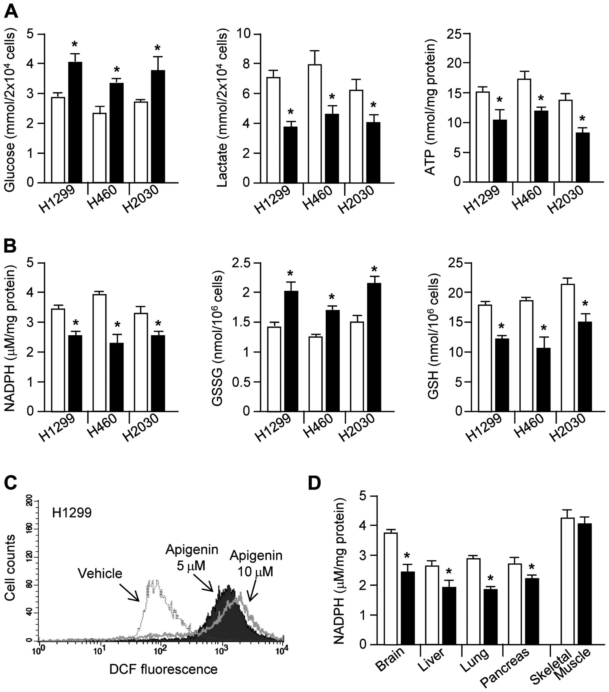 Cancer cells use large amounts of glucose to generate glycolytic intermediates and end products, including lactate, ATP, nucleotides, lipids, amino acids, and NADPH, all of which contribute to rapid cell proliferation (8). Therefore, we investigated whether apigenin can block glucose utilization in cancer cells. Interestingly, glucose consumption, lactate production, and ATP production were all strongly decreased by apigenin treatment (Fig. 2A). Glucose-6-phosphate, which is produced from glucose, can be shunted into the oxidative branch of the PPP by glucose-6-phosphate dehydrogenase, thereby generating NADPH and promoting redox homeostasis (26,27). Here, we demonstrated that NADPH generation by the oxidative branch of the PPP is decreased by apigenin treatment. Fig. 2B shows that, in apigenin-treated lung cancer cells, NADPH and GSH levels were significantly decreased, whereas GSSG levels were increased. Since NADPH maintains redox homeostasis through generation of GSH, which is necessary for the elimination of hydrogen peroxide (H2O2) by glutathione peroxidase (GPx) (27), we measured intracellular ROS levels. As we had hypothesized, intracellular ROS levels were strongly increased in apigenin-treated H1299 cells (Fig. 2C). Fig. 2D shows significantly decreased NADPH levels in the brain, liver, lung, and pancreatic tissues derived from apigenin-treated mice. These results suggest that apigenin induces oxidative stress through destruction of glucose utilization-mediated redox homeostasis.