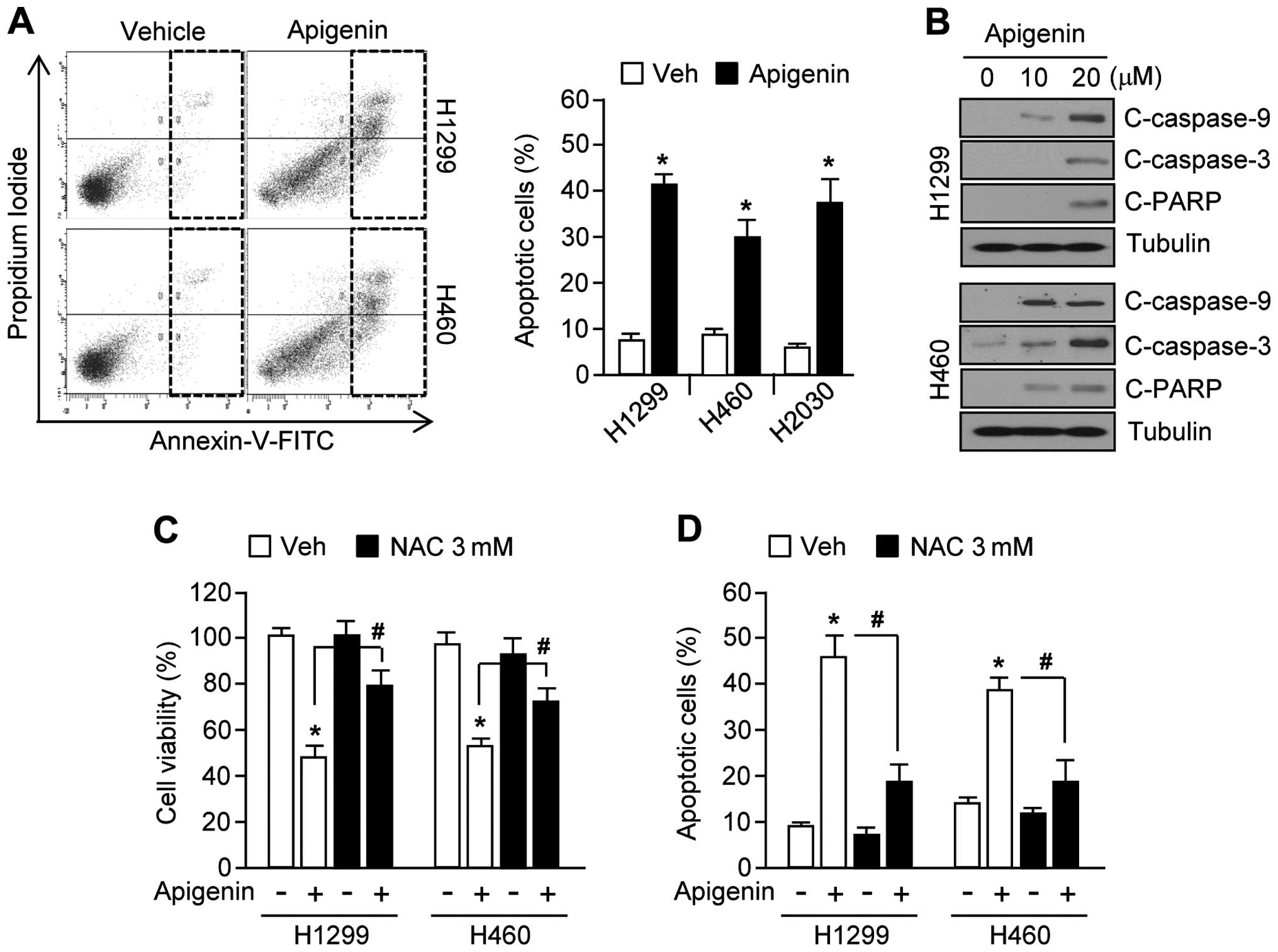 Because apoptotic signal transduction cascades involving caspase-9, -3 and PARP cleavage can be activated by increased ROS levels (9,28), we examined whether apigenin could likewise increase apoptosis through this pathway. Fig. 3A shows that apoptotic cell numbers were increased by ~30% in apigenin-treated H1299, H460, and H2030 lung cancer cells. Furthermore, in H1299 and H460 cells, apigenin increased caspase-9, -3 and PARP cleavage in a dose-dependent manner (Fig. 3B). In addition, apigenin-induced apoptosis may be mediated by elevated ROS levels in H1299 and H460 cells, because treatment with the antioxidant, N-acetyl-L-cysteine (NAC), significantly rescued cell viability (Fig. 3C), and suppressed cell apoptosis (Fig. 3D). Taken together, these results show that accumulation of ROS mediates apigenin-induced apoptosis.