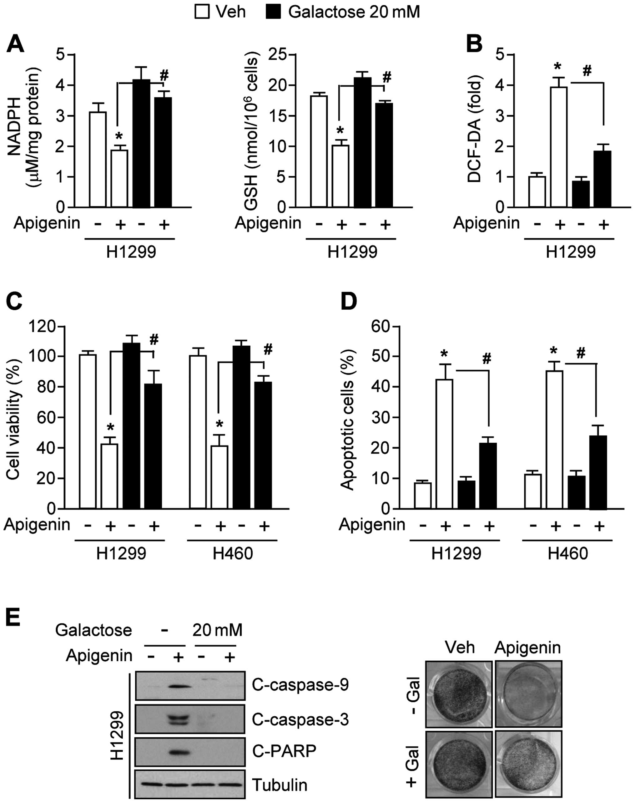 Because galactose supports NADPH production and cancer cell proliferation largely through its metabolism in the pentose phosphate pathway (26,29), we examined whether galactose supplementation could attenuate apigenin-mediated oxidative stress. Interestingly, the decreased levels of NADPH and GSH in apigenin-treated H1299 cells were strongly reversed in the presence of 20 mM galactose (Fig. 4A). Moreover, galactose decreased ROS levels by ~50% (Fig. 4B). Fig. 4C shows that galactose increased cell viability by ~40% in apigenin-treated H1299 and H460 cells. Consistent with these results, the numbers of apoptotic cells were also markedly decreased by ~20% in the presence of apigenin with galactose supplemented cells (Fig. 4D). Fig. 4E shows that apigenin-mediated activation of caspase-9, -3 and PARP apoptotic pathways (left panel) and decreased clonogenic cell survival (right panel) were completely blocked by 20 mM galactose in H1299 lung cancer cells. Together, these results indicate that galactose confers resistance to apigenin-mediated apoptosis by activating NADPH production through the pentose phosphate pathway.