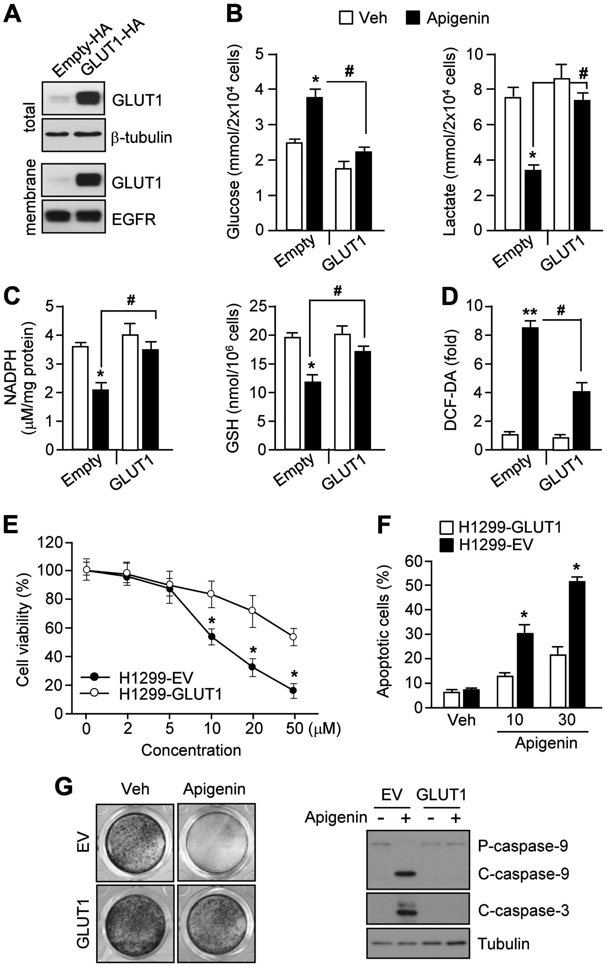 Because apigenin induces cancer cell death by suppressing GLUT1 expression and glucose utilization in multiple types of cancer cell lines, we examined whether GLUT1-overexpressing cancer cells could confer resistance to apigenin-induced apoptosis. For this purpose, we generated H1299 cell stably expressing a GLUT1 lentiviral vector, or an empty vector (Fig. 5A). Fig. 5B shows that, even in the presence of apigenin, glucose consumption increased dramatically in GLUT1-overexpressing H1299 cells compared to cells harboring the empty vector. Furthermore, GLUT1 overexpression produced high levels of lactate in apigenin-treated H1299 cells compared to levels of lactate in cells carrying the empty vector. To determine whether GLUT1 overexpression could block apigenin-mediated suppression of NADPH and GSH production, we measured intracellular NADPH and GSSG levels in GLUT1-overexpressing H1299 cells in the presence or absence of apigenin. Interestingly, the effects of apigenin on NADPH and GSH levels were significantly rescued by GLUT1 overexpression (Fig. 5C). Furthermore, GLUT1 overexpression attenuated the effect of apigenin on ROS, resulting in a clear decrease in ROS levels of ~50% (Fig. 5D). Because increased oxidative stress is a critical step for apigenin-mediated apoptosis, we examined whether GLUT1-overexpressing cells were resistant to apigenin-mediated cell death. Fig. 5E shows that 50 μM apigenin was required to decrease cell viability in GLUT1-overexpressing cells, while 10 μM apigenin was sufficient to decrease cell viability in cells harboring the empty vector. Fig. 5F shows that 30 μM apigenin induced 20% of the cells to undergo apoptosis in GLUT1-overexpressing H1299 cells. In contrast, 30 μM apigenin induced 50% of cells harboring the empty vector to undergo apoptosis. Furthermore, GLUT1 overexpression dramatically reversed the apigenin-mediated suppression of clonogenic cell survival (Fig. 5G, left panel) and attenuated the activation of caspase-9 and caspase-3 in H1299 cells (Fig. 5G, right panel). These results suggest that GLUT1 overexpression causes resistance to apigenin-mediated apoptosis through suppression of metabolic and oxidative stress.