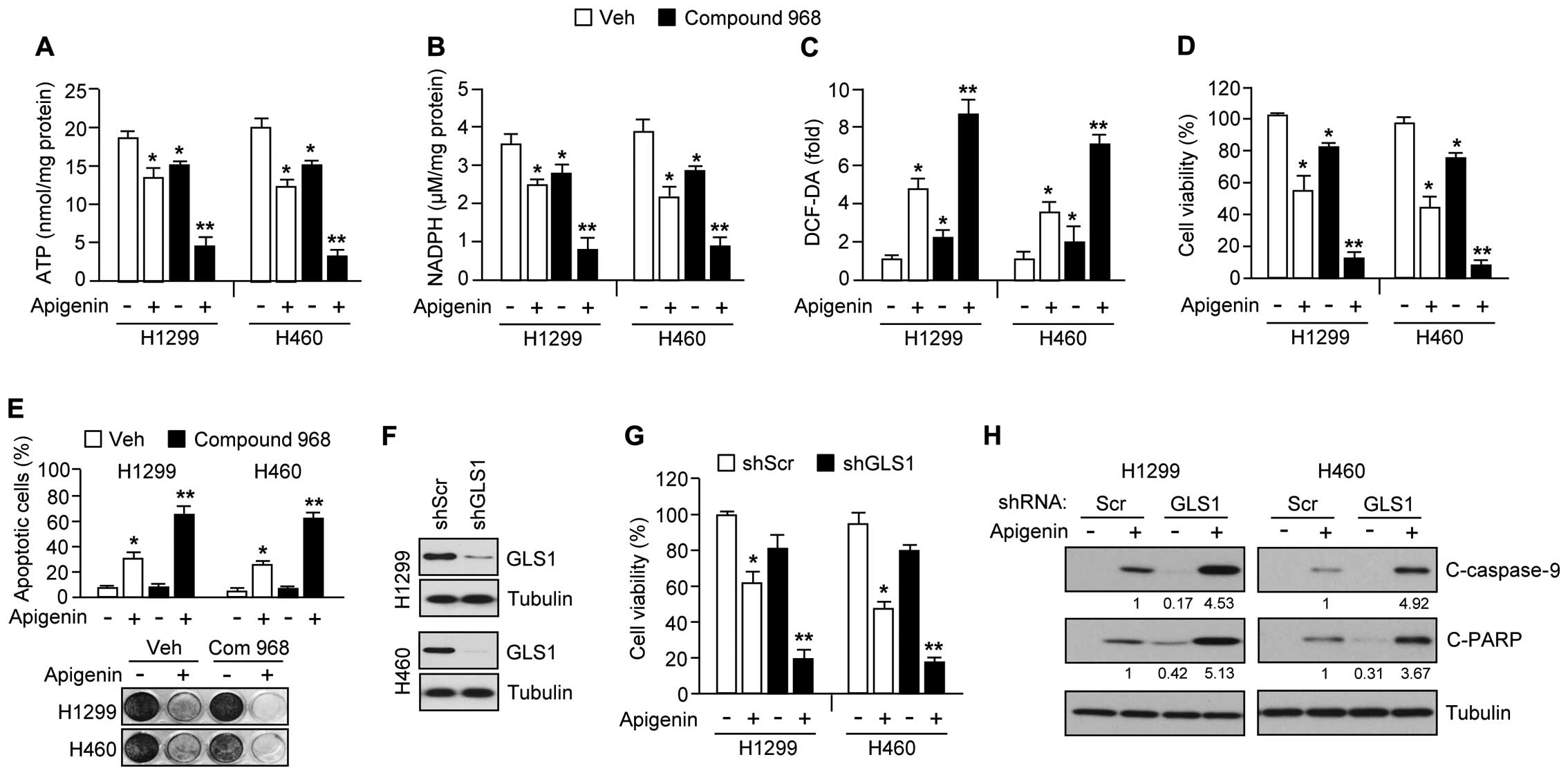 In cancer cells, glutamine is a nutrient critical for promotion of tumor growth and survival (30,31). Thus, inhibitors targeting glutamine utilization have shown potential as anticancer drugs (18–20). We therefore hypothesized that inhibition of glutamine utilization might sensitize cancer cells to apigenin-mediated cell death, and that the mechanism would involve suppression of the major pathways of glucose and glutamine metabolism required for tumor growth and survival. In support of this idea, Fig. 6A shows that compound 968, a GLS inhibitor, synergized with apigenin, resulting in an ~75% reduction of ATP levels in H1299 and H460 cells. Because glutamine utilization supports NADPH production needed for redox control (31), we additionally examined whether combination treatment of apigenin and compound 968 is sufficient to increase severe oxidative stress by decreasing NADPH and increasing intracellular ROS levels in cancer cells. Here, we found that compound 968 hugely decreased NADPH (Fig. 6B) and increased intracellular ROS levels (Fig. 6C) in the presence of apigenin. Furthermore, apigenin-treated cells, compound 968 exacerbated the reduction in cell viability (Fig. 6D), increased the induction of apoptosis (Fig. 6E, upper panel), and reduced clonogenic cell survival (Fig. 6E, bottom panel). In addition, we used a short hairpin RNA (shRNA) to knock down GLS1 expression by >70% in H1299 and H460 cell (Fig. 6F). Fig. 6G shows that apigenin caused a large decrease in cell viability of ~80% in GLS1 knocked-down H1299 and H460 cells. Consistent with this, caspase-9 and PARP were more strongly activated in these cells (Fig. 6H), suggesting that decreased GLS1 expression or activity would make cancer cells more susceptible to apigenin-mediated apoptosis. Taken together, these results indicate that inhibition of glutamine utilization should sensitize lung cancer cells to apigenin-mediated apoptosis.