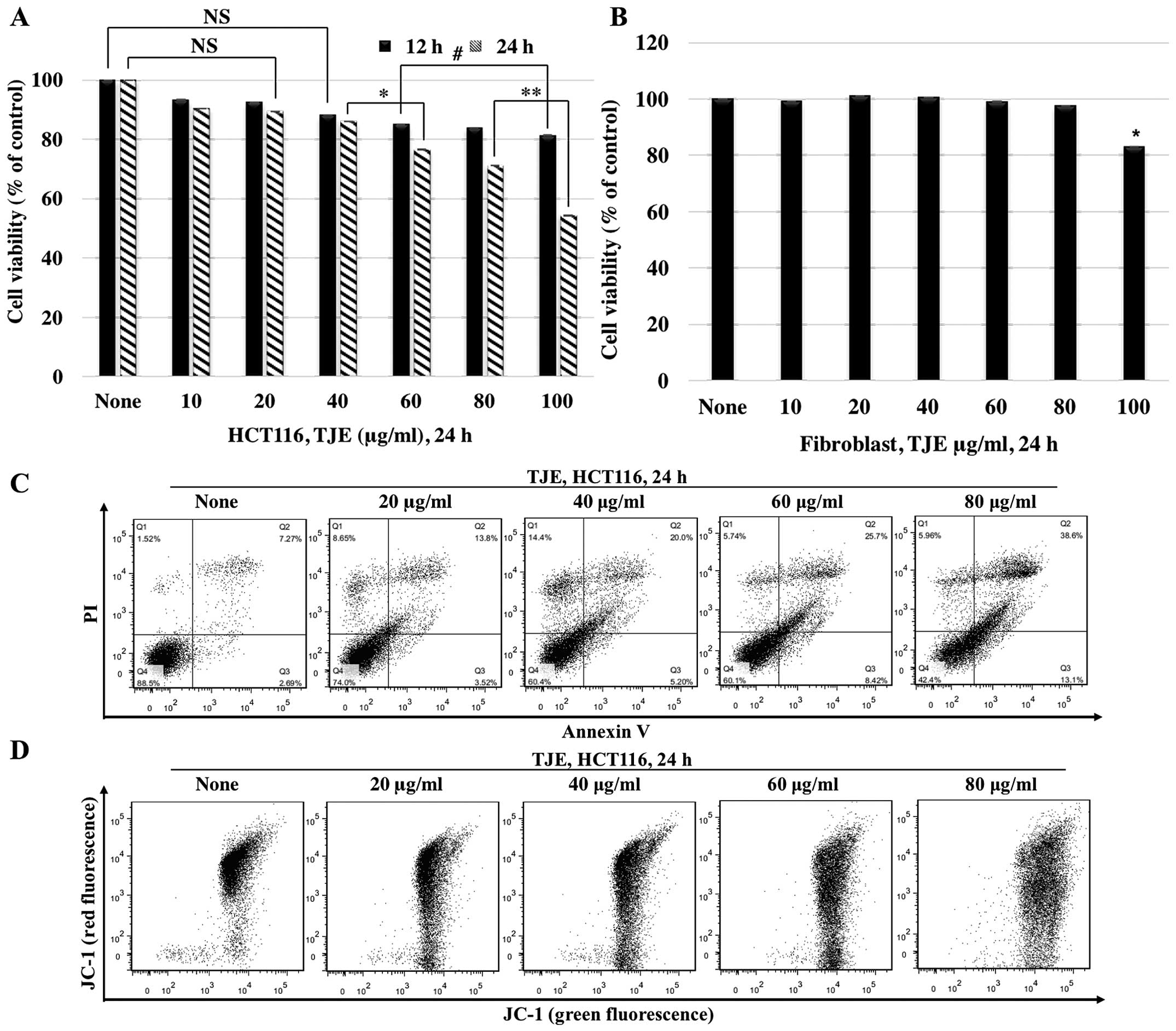 We investigated the anti-proliferative and apoptotic effects of TJE. We treated cells with TJE (10–100 μg/ml) for 12 and 24 h, and then assayed for cellular viability and apoptosis. Cells treated with TJE showed a decrease in viability and an increase in the number of Annexin V-positive cells in a dose-dependent manner. In normal human fibroblasts, however, TJE had no effect on cellular viability (Fig. 1A–C).