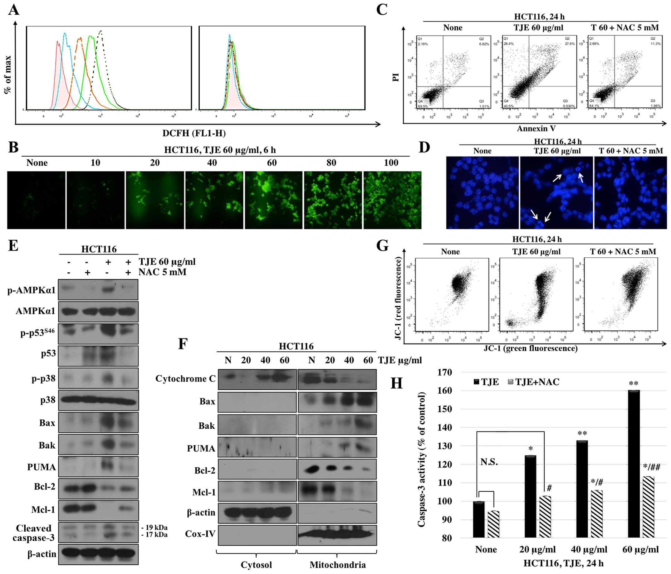 We examined whether TJE promotes the generation of ROS in HCT116 colon cancer cells. We measured intracellular ROS levels following treatment of cells with TJE (20–80 μg/ml) for 6 h. As shown in Fig. 3A (left panel), TJE increased ROS levels at the indicated concentrations. These effects were completely blocked by co-treatment with NAC, a ROS scavenger (right panel).
