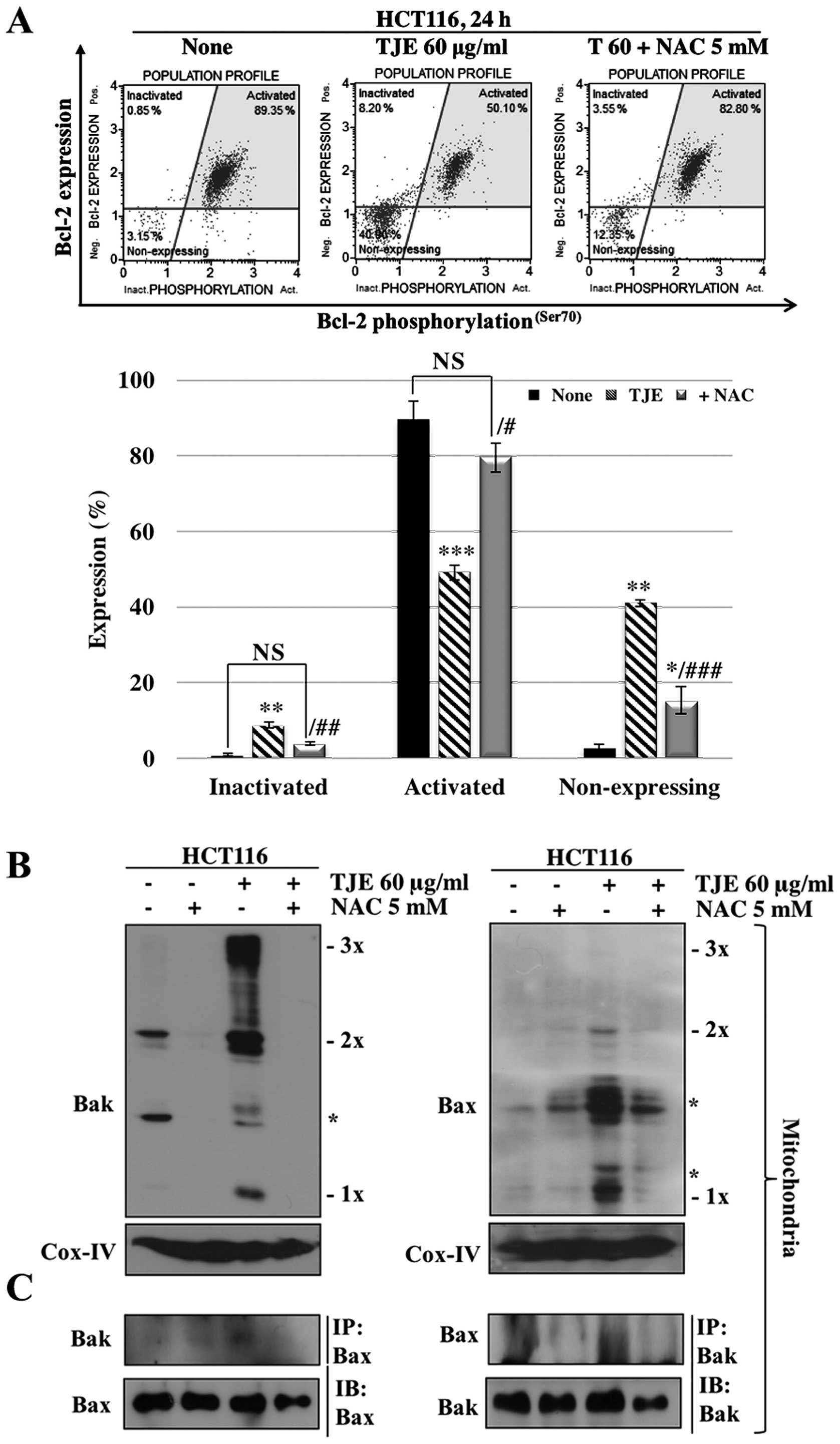 To make sure that the increase in intracellular ROS levels was related to TJE-regulated signaling proteins and the induction of apoptosis, we co-treated cells with NAC and then analyzed protein levels and the concentration of Annexin V-positive cells. The cells co-treated with NAC and TJE did not undergo increases in AMPK, p38 or p53 phosphorylation and showed decreased expression, oligomerization, and binding of apoptosis-related proteins and increases in the expression of anti-apoptotic proteins in comparison to cells treated with TJE alone (Figs. 3E and 4). In addition, cells co-treated with TJE and NAC did not undergo cell death and did not exhibit a reduction in the mitochondrial membrane potential (Fig. 3F). By contrast, TJE-treated cells displayed increased levels of apoptotic cell death through changes in the mitochondrial membrane potential which led to secretion of cytochrome c from the mitochondria to the cytosol (Fig. 3G). Generally, cytochrome c in the cytosol initiates caspase cleavage and activates effector caspases such as caspase-3, which in turn induce apoptosis. We demonstrated that TJE induced caspase-3 activation dose-dependently. Co-treatment with NAC abolished this effect (Fig. 3H).