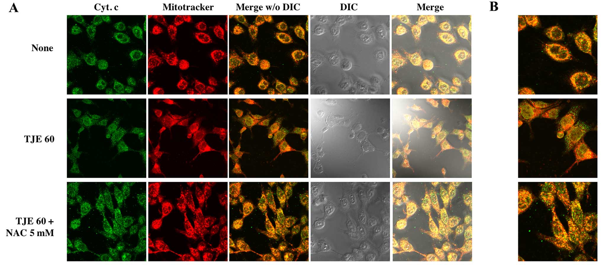 To show that TJE treatment induced cytochrome c release from the mitochondria to the cytosol, we co-treated cells with TJE and NAC for 24 h and stained cells in order to visualize the mitochondria and cytochrome c. In TJE-treated cells, cytochrome c translocated from the mitochondria to the cytosol; in contrast, in control cells and those co-treated with both TJE and NAC, cytochrome c remained in the mitochondria (Fig. 5).