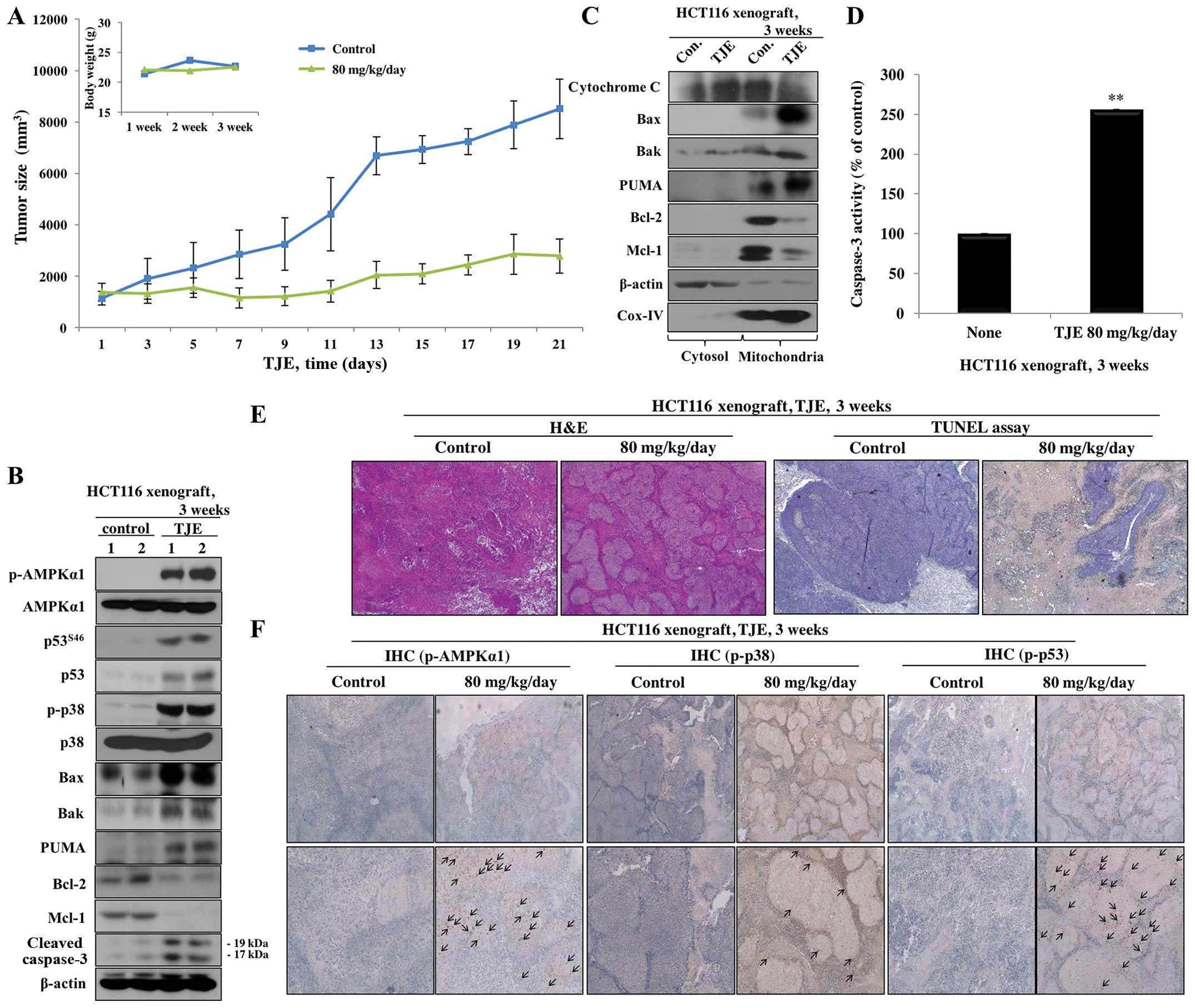 To analyze the consequences of TJE treatment in an HCT116 xenograft model of tumor growth, we performed histological analysis from control- and TJE (80 mg/kg/day)-treated tumor tissue stained with H&E using the TUNEL assay. The amount of tumor tissue in TJE-treated samples was considerably less than that of control samples (Fig. 7A). The number of TUNEL-positive cells was significantly increased and cancer tissue was degraded in TJE-treated samples (Fig. 7E). In addition, in a similar in vitro experiment, the AMPK/p38 MAPK and p53 signaling pathways were activated, and apoptosis-related proteins showed an increase in expression and translocation to the cytosol (Fig. 7B–D and F).