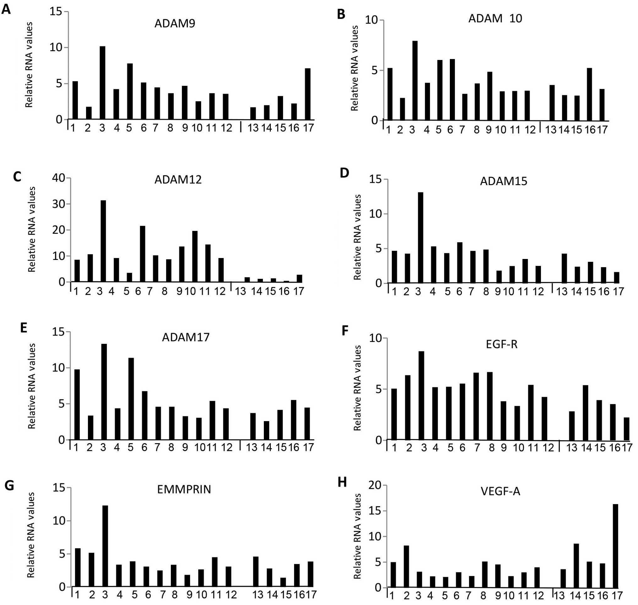 Next, we statistically analysed the data to see if there were any meaningful patterns or correlations for 13 selected MMPs, ADAMs, growth factors and receptors ( MMP2 and 14, ADAM9, 10, 12, 15 and 17, TIMP-1, -2 and -3, EGF-R, EMMPRIN and VEGF-A) which were very highly expressed. Figs. 3 and 4 show the relative RNA levels for individual samples while Fig. 5 represents box plots for select genes grouped according to meningioma subtype (fibroblastic, transitional and meningothelial). Relative RNA expression was normalized to 18S rRNA levels and is presented relative to normal brain sample. Although the sample size was small, [F (fibroblastic) n=4, T (transitional) n=3 and M (meningothelial) n=6], some trends were evident, in that the fibroblastic subtype generally showed more expression compared with the meningothelial whereas the transitional showed intermediate expression, particularly for MMP14, ADAM9, 10, 12, 15 and 17, TIMP-2, EGFR and EMMPRIN. Overall, the fibroblastic meningiomas displayed the highest median levels for 10 of the 13 selected gene expressions as well as having the maximum expression in 11 out of 13 of them.