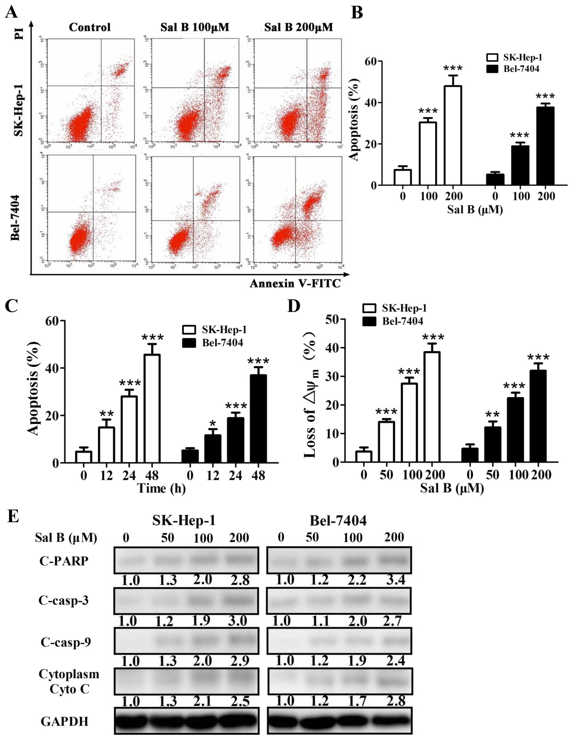 Then we measured the mitochondrial membrane potential (ΔΨm) by flow cytometry and found that Sal B treatment led to depolarization of ΔΨm in a dose-dependent manner (Fig. 2D). Western blot analyses showed that cleaved caspase-9, cleaved caspase-3, cleaved poly(ADP-ribose) polymerase (PARP), and cytosolic Cyto c were increased after treatment with Sal B for 24 h (Fig. 2E). The level of cleaved PARP, cleaved caspase-3, cleaved caspase-9, and cytosolic Cyto c increased 2.8-, 3.0-, 2.9- and 2.5-fold, respectively, in SK-Hep-1 cells treated with 200 μM Sal B for 24 h (Fig. 2E). The level of cleaved PARP, cleaved caspase-3, cleaved caspase-9, and cytosolic Cyto c increased 3.4-, 2.7-, 2.4- and 2.8-fold, respectively, in Bel-7404 cells treated with 200 μM Sal B for 24 h (Fig. 2E). These results demonstrated that Sal B induced apoptosis in the HCC cells.
