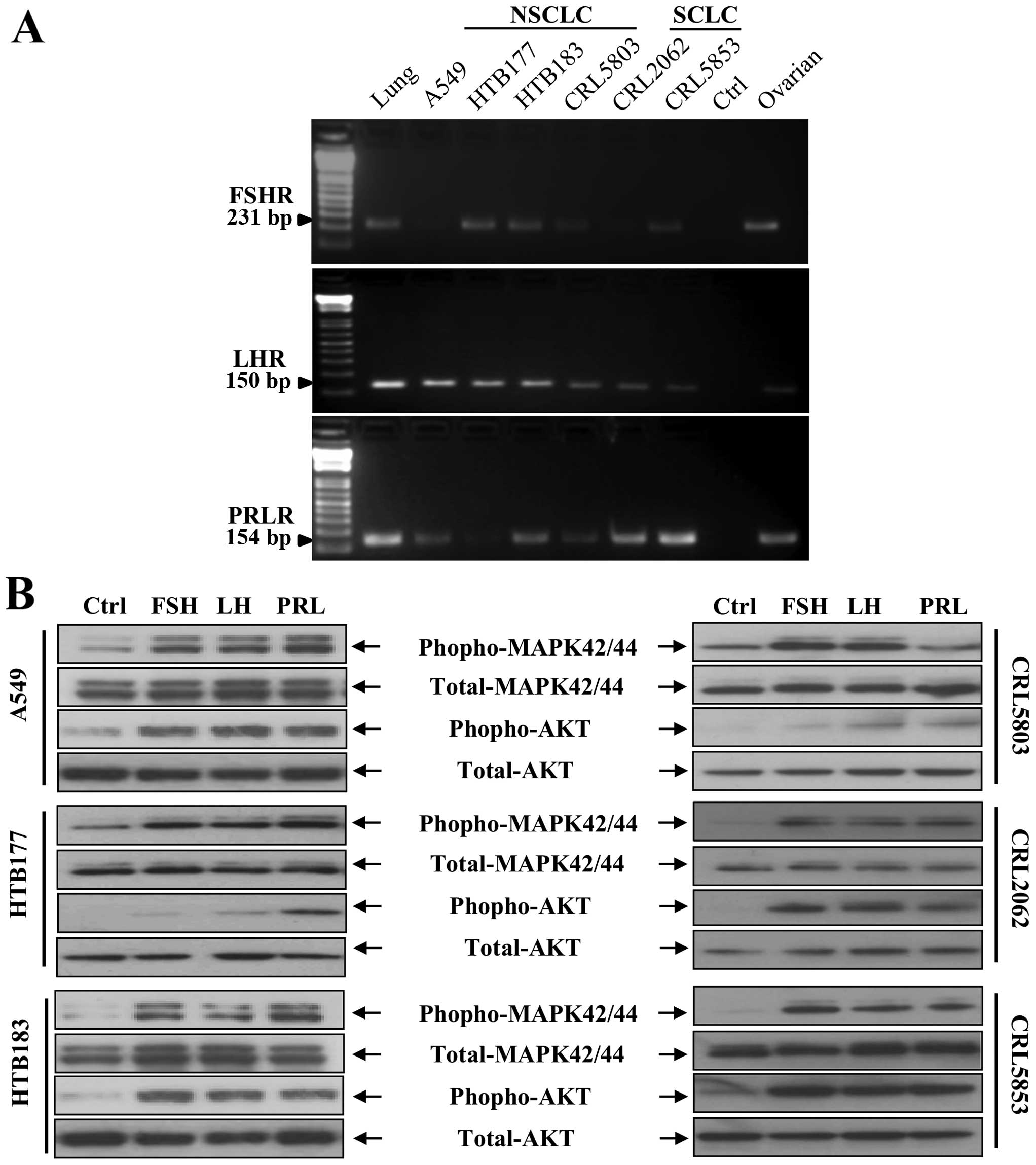 Evidence has accumulated that sex hormones (SexHs) play a role in the development and progression of several malignancies arising in the gonads (1), urogenital tract (2–4), breast (5), skeletal muscles (6) and hemato/lymphohematopoietic tissues (7). Gonadal SexHs, and in particular pituitary SexHs such as follicle-stimulating hormone (FSH), luteinizing hormone (LH), and prolactin (PRL), are potent mitogens, and their enhanced level in peripheral blood (PB) is associated with prostate, colon, and lung cancer (8–11). Based on this evidence, we became interested in the potential role of pituitary SexHs in lung carcinoma and employed four non-small cell lung cancer (NSCLC) cell lines (A549, HTB177, HTB183, and CRL5803) and two small cell lung cancer (SCLC) cell lines (CRL2062 and CRL5853) to investigate this possible linkage. We also studied tissue samples from lung cancer patients. An additional reason to pursue this question is the fact that the level of FSH increases with age as a result of aging and gradual dysfunction of the gonads (12,13). This increase could be linked to an increase in certain malignancies, including lung cancer, in the aged population (14).