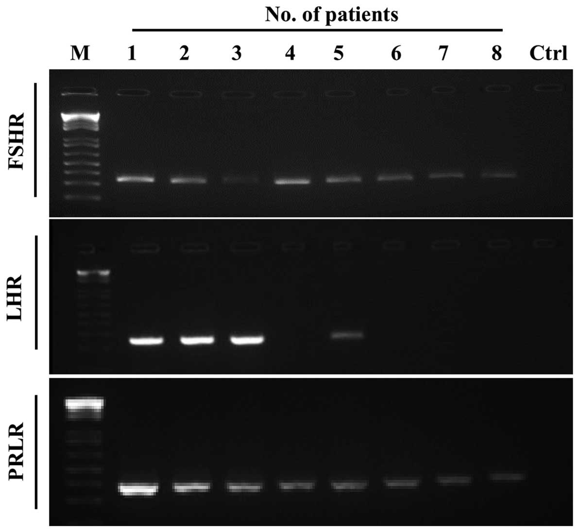 Similarly, we were able to detect FSHR and PRLR mRNA in all eight patient NSCLC samples, and in four out of eight patients we also detected the expression of LHR mRNA (Fig. 2).