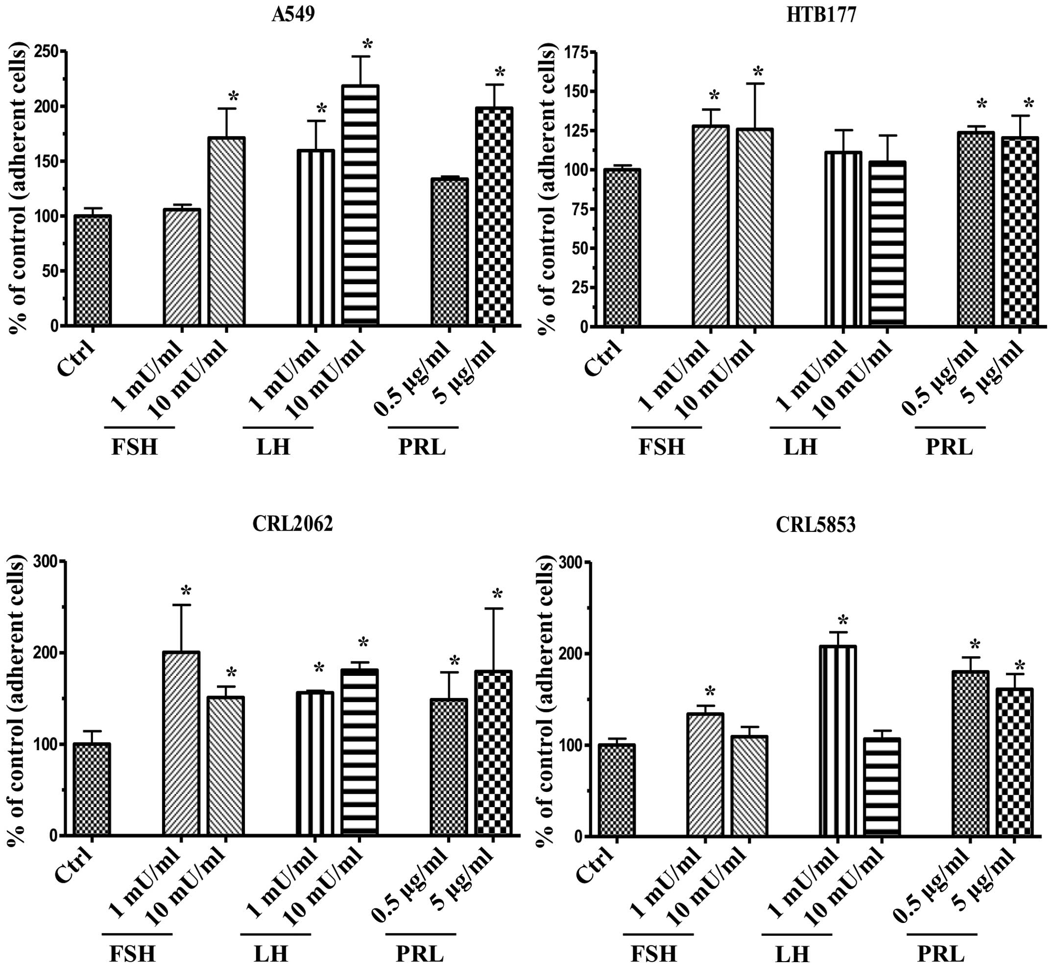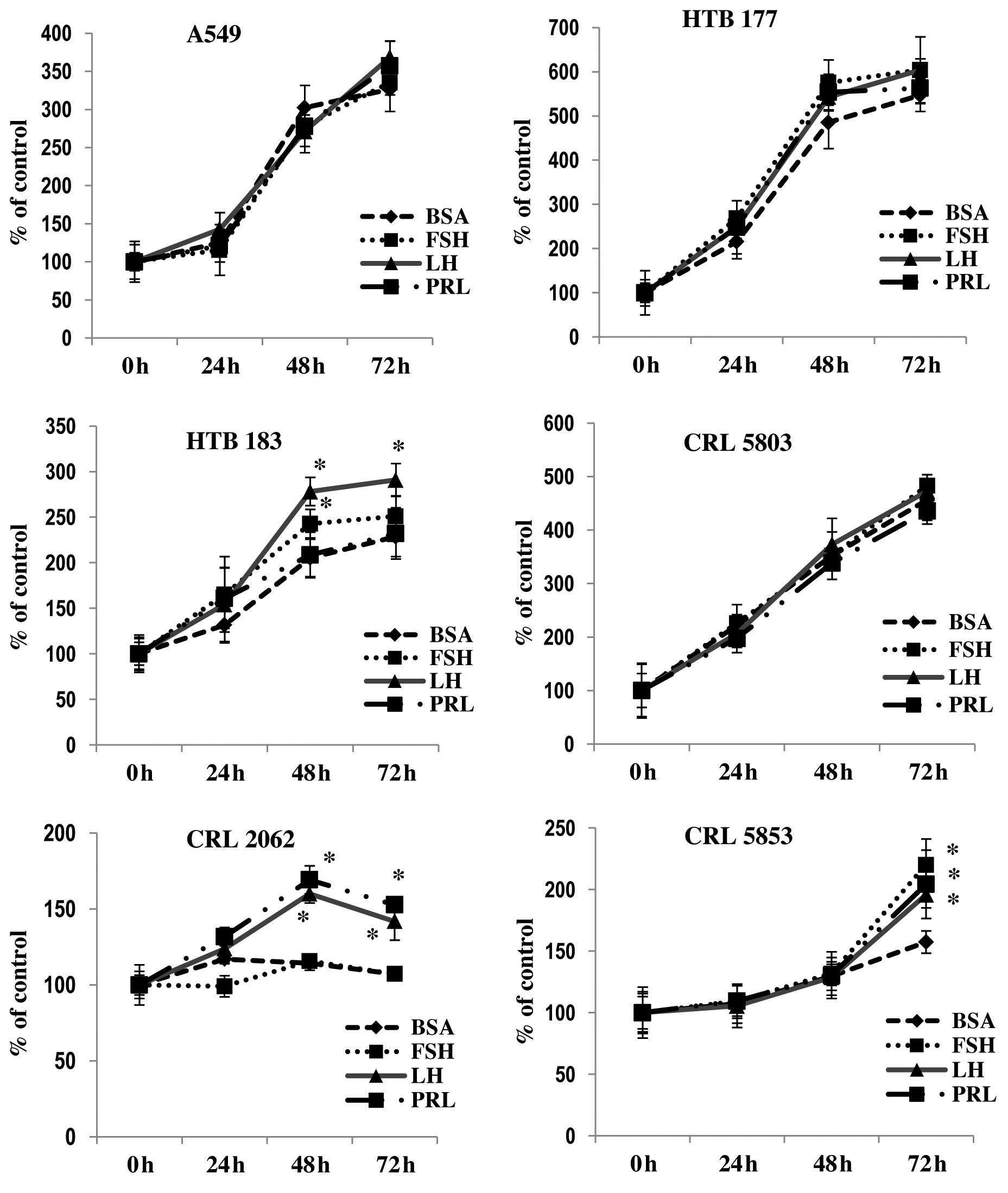 To study the effect of pituitary SexHs on proliferation of lung cancer, we exposed lung cancer cell lines to FSH, LH, or PRL in serum-free medium supplemented with 0.5% BSA (Fig. 3). We found that one NSCLC cell line (HTB183) responded to stimulation by LH and FSH and that CRL2062, which is a SCLC cell line, responded to PRL or LH by proliferation, while another SCLC cell line (CRL5853) responded to all pituitary SexHs tested in our study.