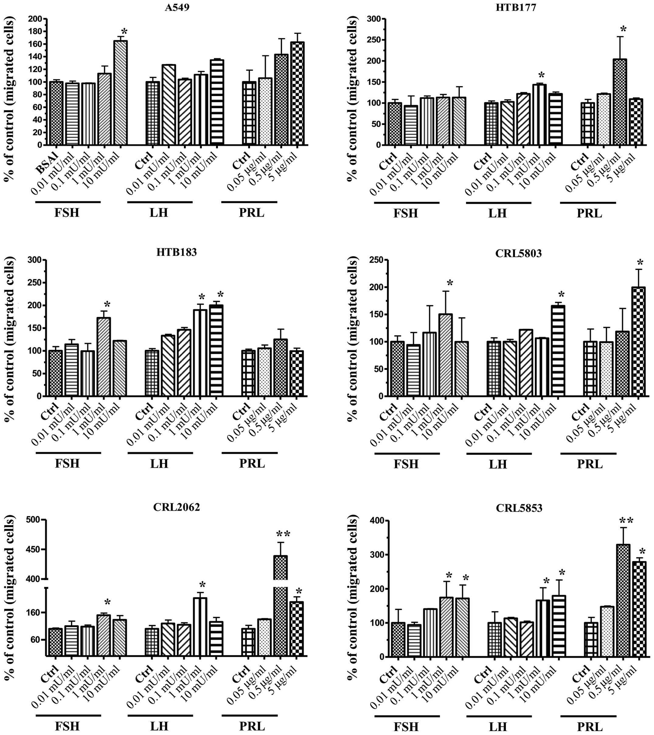 In Transwell chemotaxis assays we found that lung cancer cell lines, to different degrees, responded to pituitary SexH gradients (Fig. 4). When we employed FSH as a chemoattractant, we observed a chemotactic response for three NSCLC cell lines (A549, HTB183, and CRL5803) and both SCLC cell lines (CRL2062, CRL5853). A significant responsiveness to LH was observed for the NSCLC cell lines HTB177, HTB183, and CRL5803 and both SCLC cell lines (CRL2062, CRL5853). Chemotactic responsiveness to PRL was particularly visible for both SCLC cell lines (CRL2062, CRL5853) as well as for A549, HTB177, and CRL5803 NSCLC cell lines.