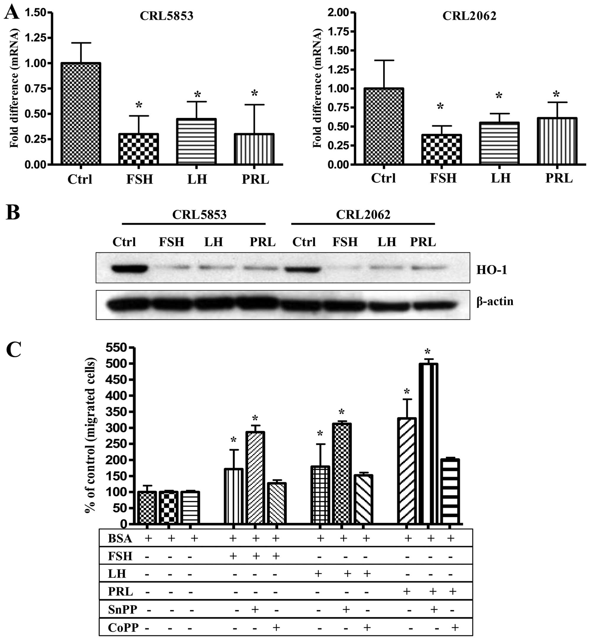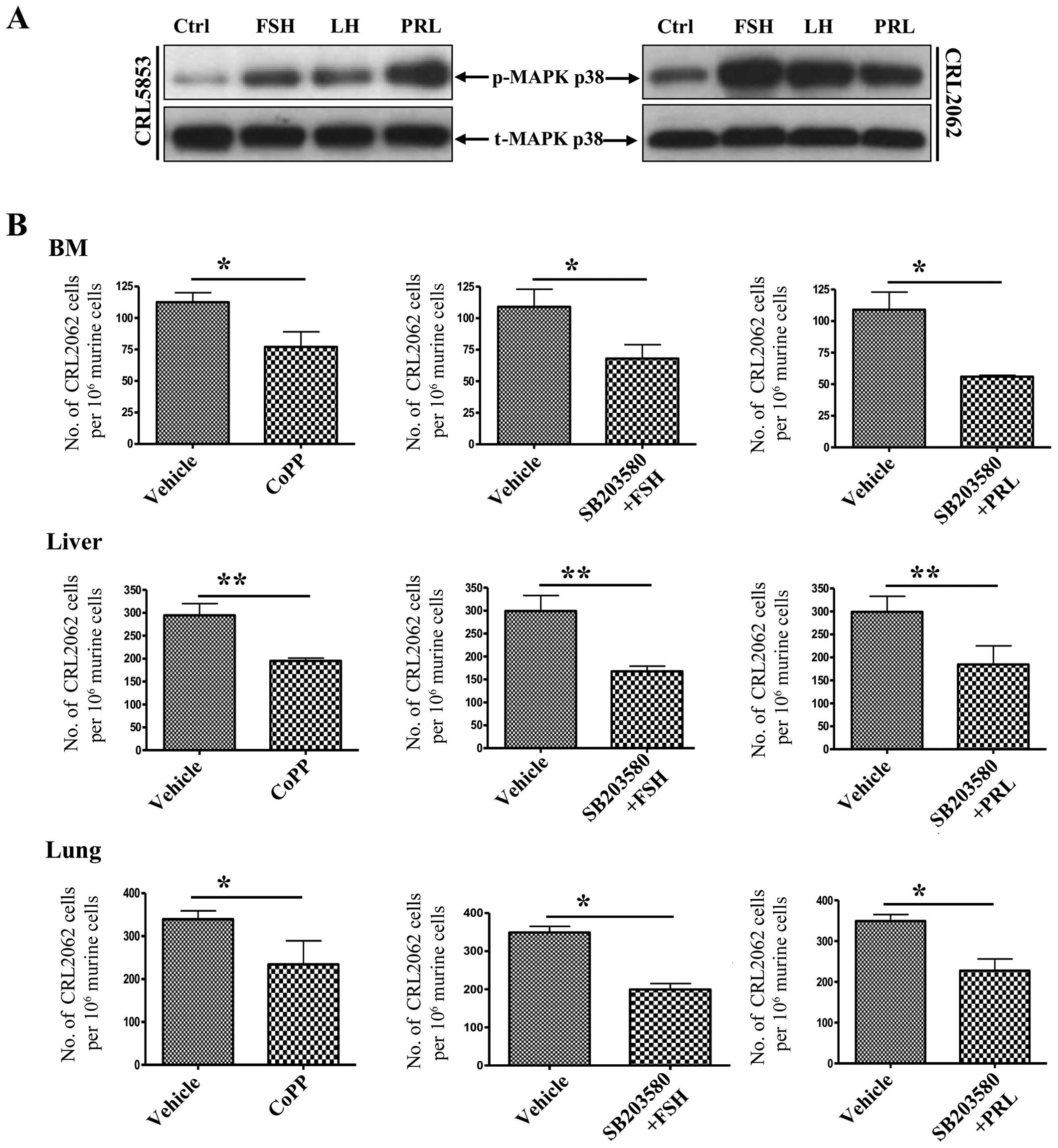 The care and use of mice was carried out in accordance with the guidelines provided by the Institutional Animal Care and Use Committee of the University of Louisville, which conform to the Guide for the Care and Use of Laboratory Animals (Department of Health and Human Services, NIH publication no. 86-23). Prior to in vivo transplantation, CRL2062 and CRL5853 cells (10×105 per mouse) were treated ex vivo with vehicle only, FSH (1 mU/ml), PRL (0.5 µg/ml), or CoPP IX chloride, a small-molecule HO-1 activator (50 µmol/l; Tocris Bioscience), for 2 h at 37°C. In parallel, cells were also pre-treated with SB203580, a p38 MAPK inhibitor (20 µmol/l), for 6 h and were afterwards subjected to FSH or PRL for a further 2-h incubation at 37°C. All cells were then washed and transplanted into severe combined immunodeficient (SCID)/beige inbred mice (n=3 per group), which were initially irradiated with 350 cGy 24 h before transplantation. At 48 h post-transplantation, bone marrows, livers, and lungs were collected, and the presence of metastasized cancer cells (i.e., murine-human chimerism) was evaluated as described (25). Briefly, genomic DNA was purified from organs using the QIAamp DNA Mini kit (Qiagen, Inc.). Next, detection of human α-satellite and murine β-actin DNA levels was carried out using real-time PCR and the ABI PRISM 7500 Fast Sequence Detection System (Applied Biosystems/Life Technologies). A 25-µl reaction mixture containing 12.5 µl SYBR-Green PCR Master Mix, 300 ng DNA template, and specific primers (α-satellite DNA sense, 5′-ACCACTCTGTGTCCTTCGTTCG-3′ and antisense, 5′-ACTGCGCTCTCAAAAGGAGTGT-3′; β-actin DNA sense, 5′-TTCAATTCCAACACTGTCCTGTCT-3′ and antisense, 5′-CTGTGGAGTGACTAAATGGAAACC-3′) was used. Real-time PCR conditions for the amplification process were as follows: 95°C (15 sec); 40 cycles at 95°C (15 sec); and 60°C (1 min). Samples without template controls were used in each run, and the ΔCt values were determined. For each cell line, the number of human cells present in the murine organs (the degree of chimerism) was calculated according to a standard curve generated by mixing different concentrations of human cells with a constant number of murine cells in a linear manner.