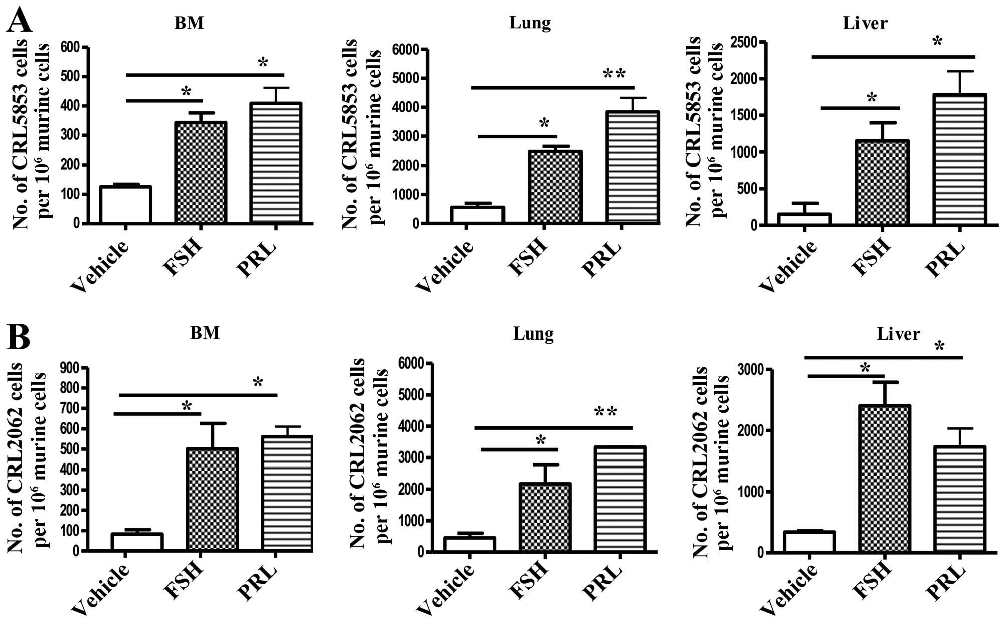 To address the role of the in vivo effect of pituitary SexHs on the metastasis of lung cancer cells, we exposed both SCLC cell lines to FSH or PRL, and after incubation the cells were injected i.v. into immunodeficient NOD/SCID mice. Fig. 7 shows that the incubation of tumor cells before injection with FSH or PRL enhanced the seeding efficiency of lung cancer cells into bone marrow, liver, and lung.