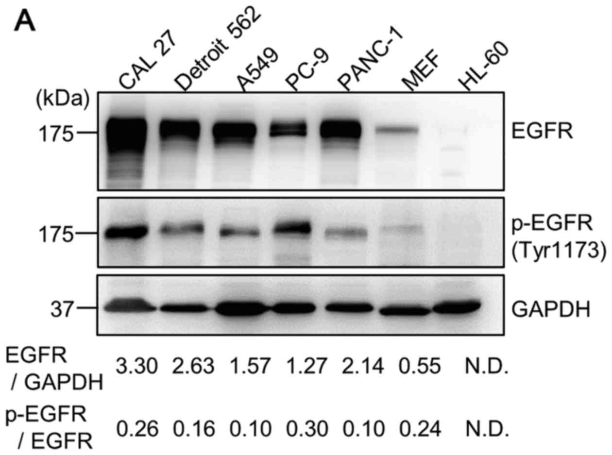 The human oral squamous cell carcinoma cell line, CAL 27, the human pharyngeal carcinoma cell line, Detroit 562, the human NSCLC cell line, A549, the human pancreatic cancer cell line, PANC-1, the human colorectal adenocarcinoma cell line, HT-29 and the breast cancer cell line, MDA-MB-231 were obtained from the American Type Culture Collection (ATCC, Manassas, VA, USA). The human NSCLC cell line, PC-9, which carries delE746-A750 in exon 19 of the EGFR gene and exhibits exquisite sensitivity to EGFR TKIs (26), was obtained from the RIKEN BioResource Center (Tsukuba, Japan). The murine embryonic fibroblast (MEF) cell line (DR-wild-type) established by SV-40 immortalization was also obtained from the ATCC. All cell lines were cultured in DMEM plus 10% fetal bovine serum (FBS; Biosera, Ringmer, UK) and 1% penicillin/streptomycin solution (Wako Pure Chemical Industries). The 'AAS' culture conditions described in this study indicate amino acid-free DMEM (048-33575; Wako Pure Chemical Industries) plus 10% FBS and 1% penicillin/streptomycin.