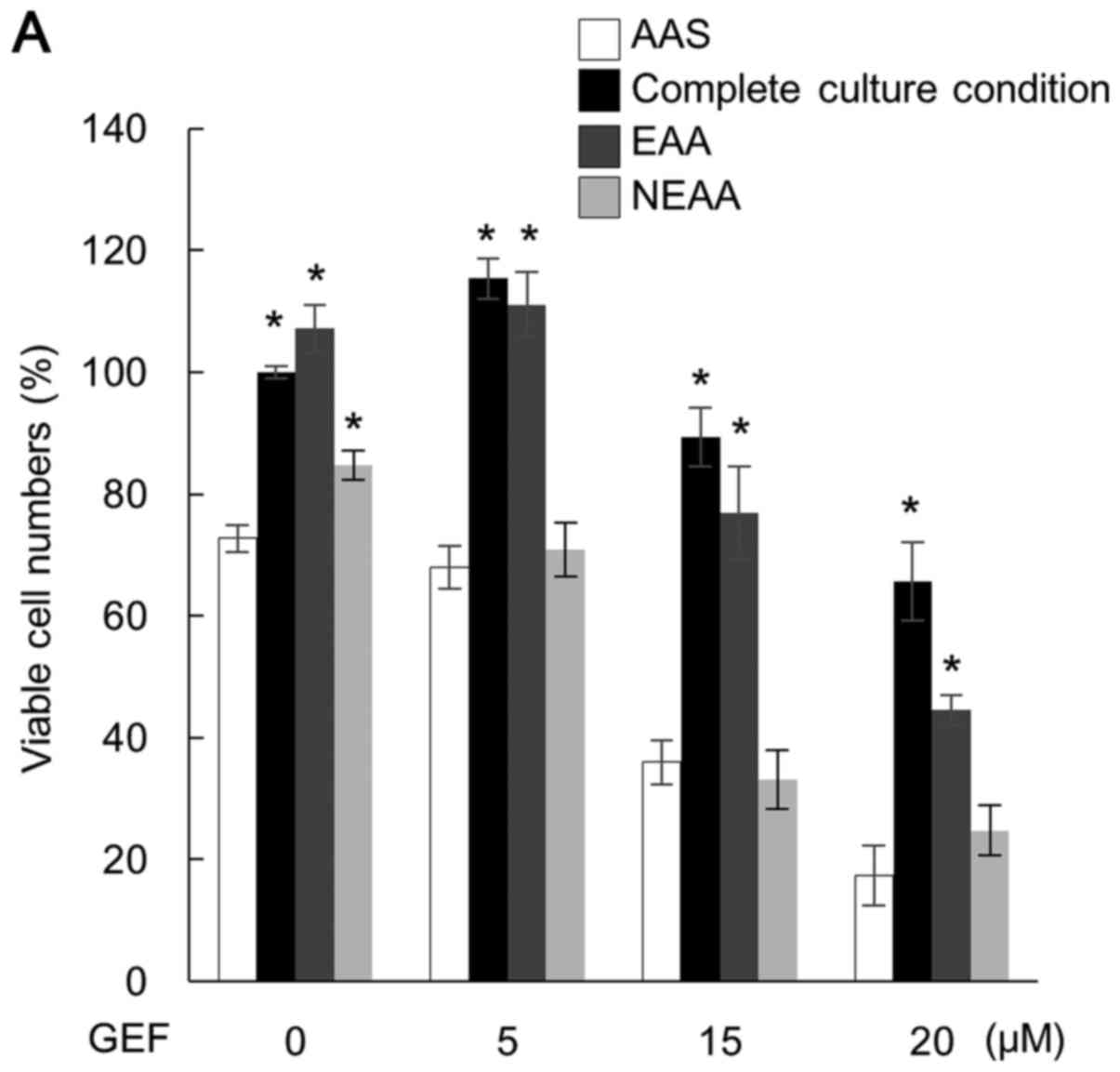 To the best of our knowledge, this is the first report showing that AAS sensitizes the killing effect of GEF in EGFR-expressing cancer cell lines (Fig. 1B). As a solid tumor appears to proliferate by adapting to nutrient insufficiency along with angiogenesis and autophagy, this has important clinical implications, such as the application of combination therapy of EGFR-TKI and LAT-1 inhibitors or anti-angiogenesis therapy for cancer patients. Indeed, it was previously reported that the phase II clinical trial of the anti-vascular endothelial growth factor monoclonal antibody bevacizumab in combination with erlotinib for advanced EGFR mutation-positive NSCLC resulted in an encouraging antitumor activity, and this could be a new first-line regimen for EGFR mutation-positive NSCLC (43,44). In addition, we previously reported that macrolide antibiotics, which have an inhibitory effect on autophagy, exerted a CHOP/GADD153-mediated cell killing effect under amino acid starvation conditions in head and neck squamous cell carcinoma cell lines (18). As shown in Fig. 2A, the addition of amino acids to the culture medium resulted in the almost complete cancellation of cytotoxicity, implying that the cell killing effect appeared to be mediated by the shortage of intracellular amino acids owing to the blockage of their recycling process. Therefore, 'tumor-starving therapy' may be a novel concept for cancer therapy.