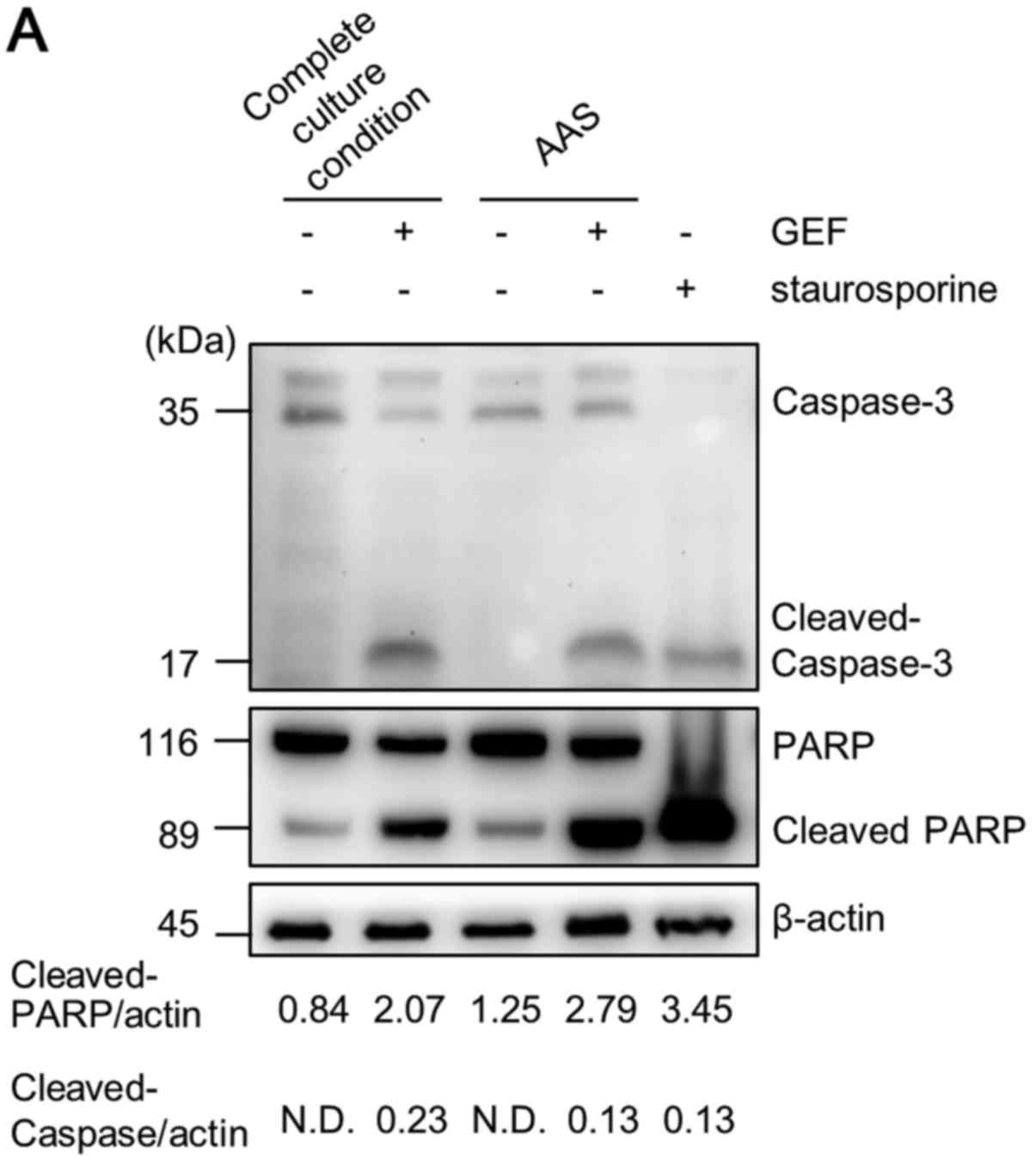 We subsequently examined whether apoptosis is involved in the enhanced GEF-induced cell death under AAS conditions. First, immunoblotting was performed to confirm the cleavage of caspase-3 and PARP as indicators of apoptosis. As shown in Fig. 3A, GEF treatment under complete culture conditions led to some cleavage of caspase-3 and PARP. However, GEF treatment under AAS culture conditions did not lead to any apparent increase in the cleavage of caspase-3 as compared with GEF treatment in complete culture medium, although the cytotoxic effect was pronounced. As shown by flow cytometry, GEF treatment under AAS culture conditions increased the number of Annexin V+/PI+ double-stained cells compared with either GEF treatment under complete culture medium conditions or culture of the cells in AAS medium without GEF. Unlike staurosporine treatment for the typical induction of apoptosis, the number of Annexin V+/PI− cells indicating the cells undergoing an early phase of apoptosis was not increased (Fig. 3B). It was recently reported that phosphatidylserine labeled with Annexin V is exposed to the cell surface prior to loss of cell integrity during necroptosis induction (34). Therefore, Annexin V positive staining does not necessarily indicate cells undergoing apoptosis. As regards the morphological findings, we could not observe any chromatin condensation and nuclear fragmentation under AAS culture conditions plus GEF treatment, whereas cells treated with staurosporine exhibited the typical apoptotic karyorrhexis and blebbing of the plasma membrane. However, we observed the translucent cytoplasm and rupture of the plasma membrane of CAL 27 cells (Fig. 3C). These results indicate that non-apoptotic cell death appeared to be involved in the pronounced cytotoxicity induced by AAS culture conditions and GEF treatment.