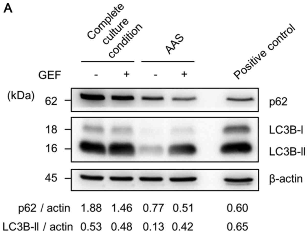 We have also reported that macrolide antibiotics, such as azithromycin (AZM) and clarithromycin (CAM) exert an inhibitory effect on autophagy flux in myeloma and squamous cell carcinoma cell lines (17,18). Of note, AZM and CAM exert cytotoxic effects under amino acid-depleted culture conditions in these cell lines along with the upregulation of the pro-apoptotic transcription factor, CHOP/GADD153, although they exhibit no cytotoxicity in complete culture medium (18). Mammalian target of rapamycin (mTOR), is a master regulator that combines amino acid availability to cell growth and autophagy (19–21). Therefore, the shortage of the intracellular amino acid pool appears to determine the sensitivity to various cellular stresses. In this context, it is important to examine whether the effect of GEF is further enhanced when cancer cells are exposed to an amino acid starvation (AAS) culture condition.