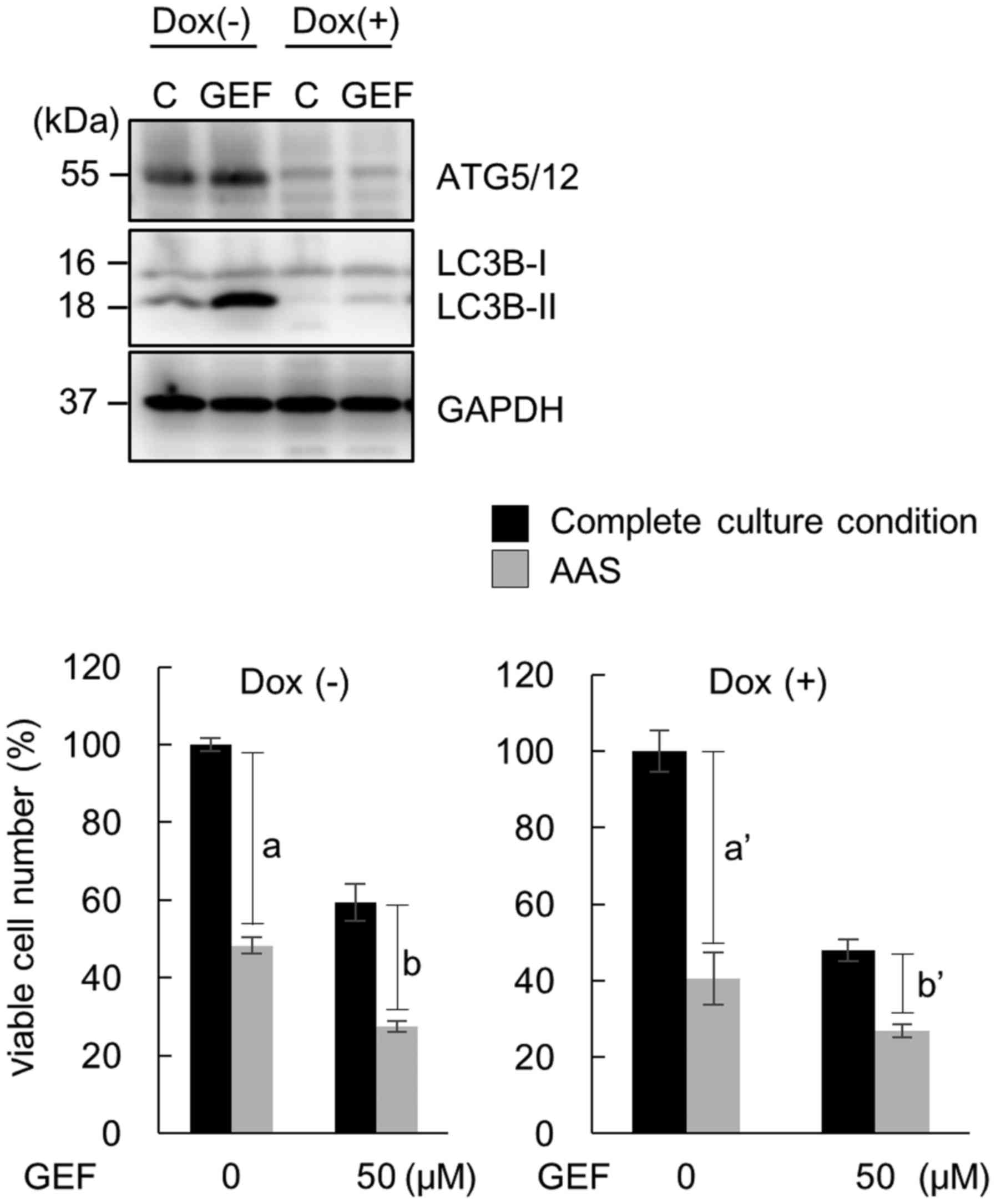 Pre-treatment of the m5–7 cells with Dox, which leads to Atg5 knockout, results in the inhibition of autophagy (27). As shown in Fig. 5, the pronounced cytotoxicity by GEF (50 µM) plus AAS was observed regardless of the deletion of the autophagic process in the m5–7 cells.
