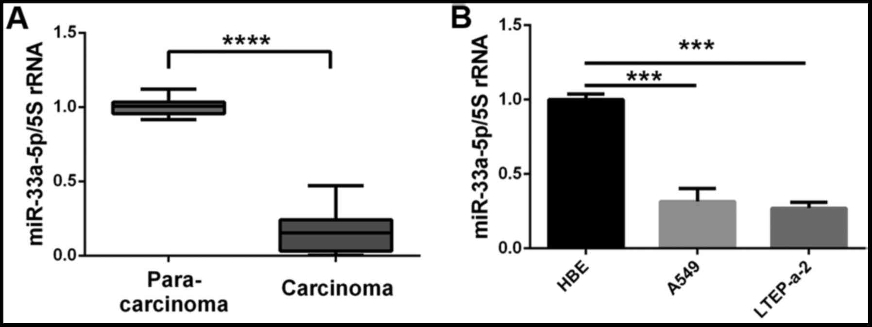 The expression of miR-33a-5p was measured in lung tumors and the corresponding adjacent tissues to examine a potential role of miR-33a-5p on the development of lung adenocarcinoma. The results demonstrated that the expression levels of miR-33a-5p were significantly lower in lung cancer tissues compared with the corresponding adjacent tissues (Fig. 1A). When examining cell lines, the expression levels of miR-33a-5p were lower in the lung adenocarcinoma cell lines LTEP-a-2 and A549 compared with the normal HBE cells (Fig. 1B). Thus, downregulation of miR-33a-5p expression is likely to be involved in the development of lung adenocarcinoma.