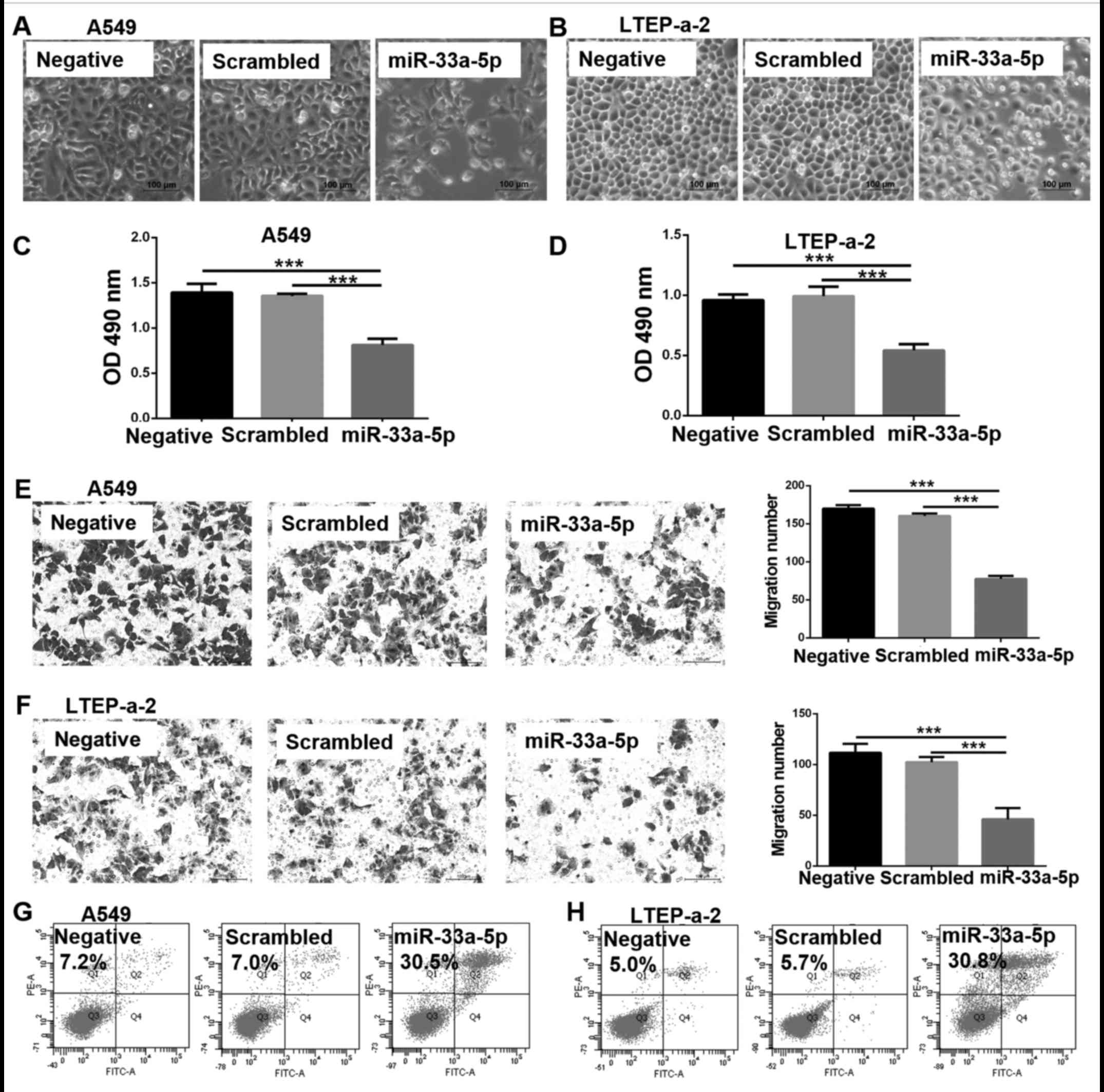 Considering the decrease in miR-33a-5p expression in lung adenocarcinoma tissues and cells, the effect of miR-33a-5p on the proliferation of lung adenocarcinoma cells was examined in vitro. At 48 h following transfection of miR-33a-5p mimics into A549 and LTEP-a-2 cells, a lower number of cells was observed in the miR-33a-5p overexpression group compared with the scrambled control group, in both the cell lines tested (Fig. 2A and B). In addition, MTT assay was used to measure cell viability. The OD value of the overexpression group was decreased compared with the scrambled control group (Fig. 2C and D), which indicated that cell proliferation in the overexpression group was inhibited. The results of the Transwell cell migration assays demonstrated that the migration ability of A549 and LTEP-a-2 cells was significantly inhibited following miR-33a-5p overexpression (Fig. 2E and F). Furthermore, miR-33a-5p overexpression enhanced apoptosis; the % of apoptotic cells was over four times higher in the miR-33a-5p overexpression group compared with the scrambled control group for both the A549 (Fig. 2G) and LTEP-a-2 (Fig. 2H) cells.