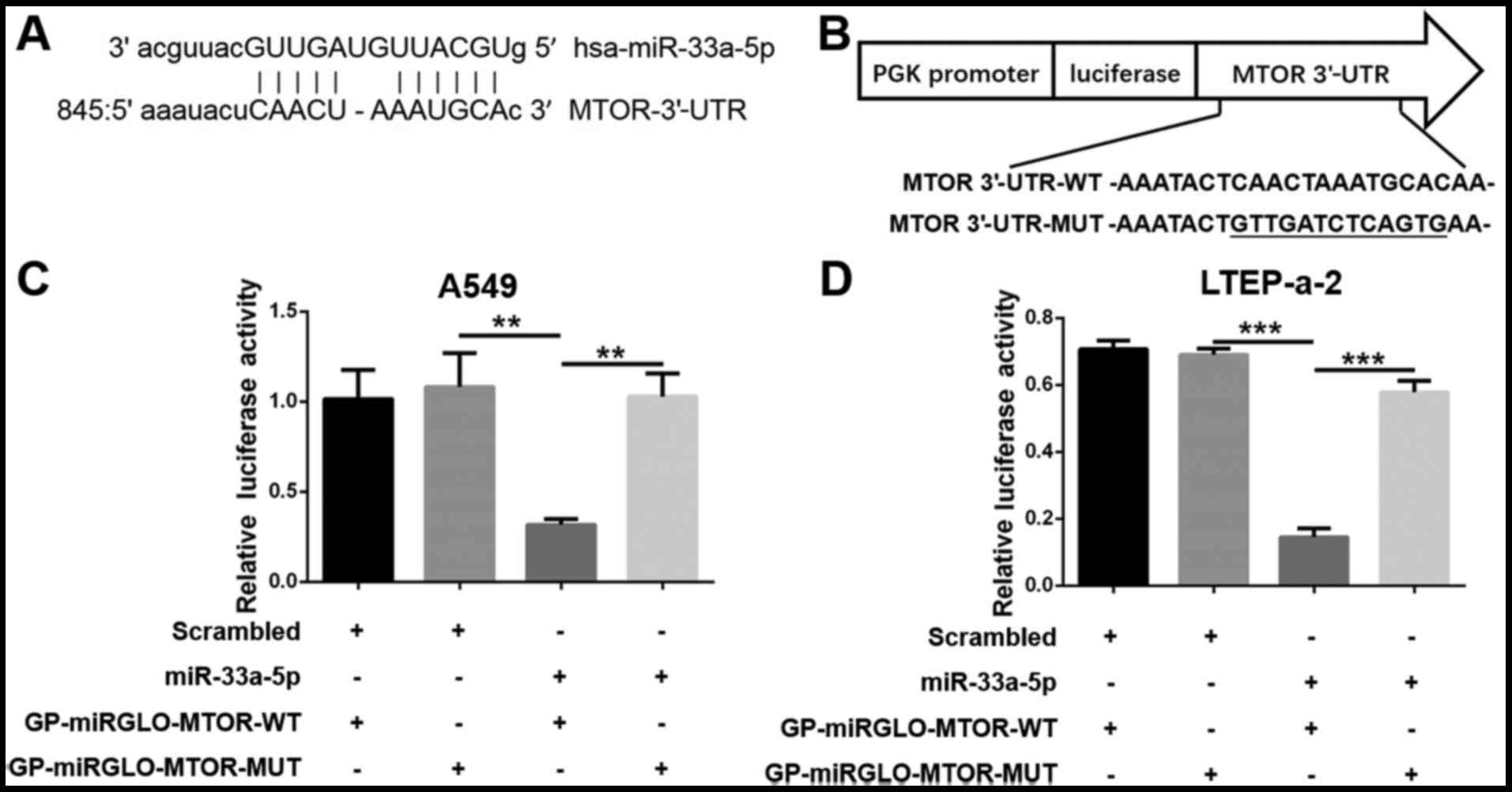 A miRNA could inhibit the proliferation of lung adenocarcinoma cells by modulating the expression of its target genes. Therefore, predicted target genes were examined for miR-33a-5p by bioinformatics analysis (www.microrna.org/microrna/getMirnaForm.do and www.targetscan.org/index.html) and matching sites were identified on the 3′-UTR of the mTOR gene (Fig. 3A). According to the mechanism of miRNA function, miR-33a-5p likely affects the expression of mTOR by binding to the mTOR-3′-UTR. Wild-type (WT) mTOR-3′-UTR was cloned downstream of the Firefly luciferase gene to construct the GP-miRGLO-mTOR-WT dual-luciferase vector. In addition, the predicted binding sites (852-863 bp) were replaced with the complementary sequences to construct the mutant (MUT) GP-miRGLO-mTOR-MUT vector (Fig. 3B). The cells were transfected with the GP-miRGLO-mTOR-WT or GP-miRGLO-mTOR-MUT vector, together with miR-33a-5p mimics or scrambled control. Luciferase activity was detected after 48 h incubation. The results demonstrated that the relative luciferase activity significantly decreased in the cells transfected with the GP-miRGLO-mTOR-WT vector and miR-33a-5p mimics (Fig. 3C and D). No notable difference was observed between cells transfected with GP-miRGLO-mTOR-MUT vector and miR-33a-5p mimics (Fig. 3C and D).