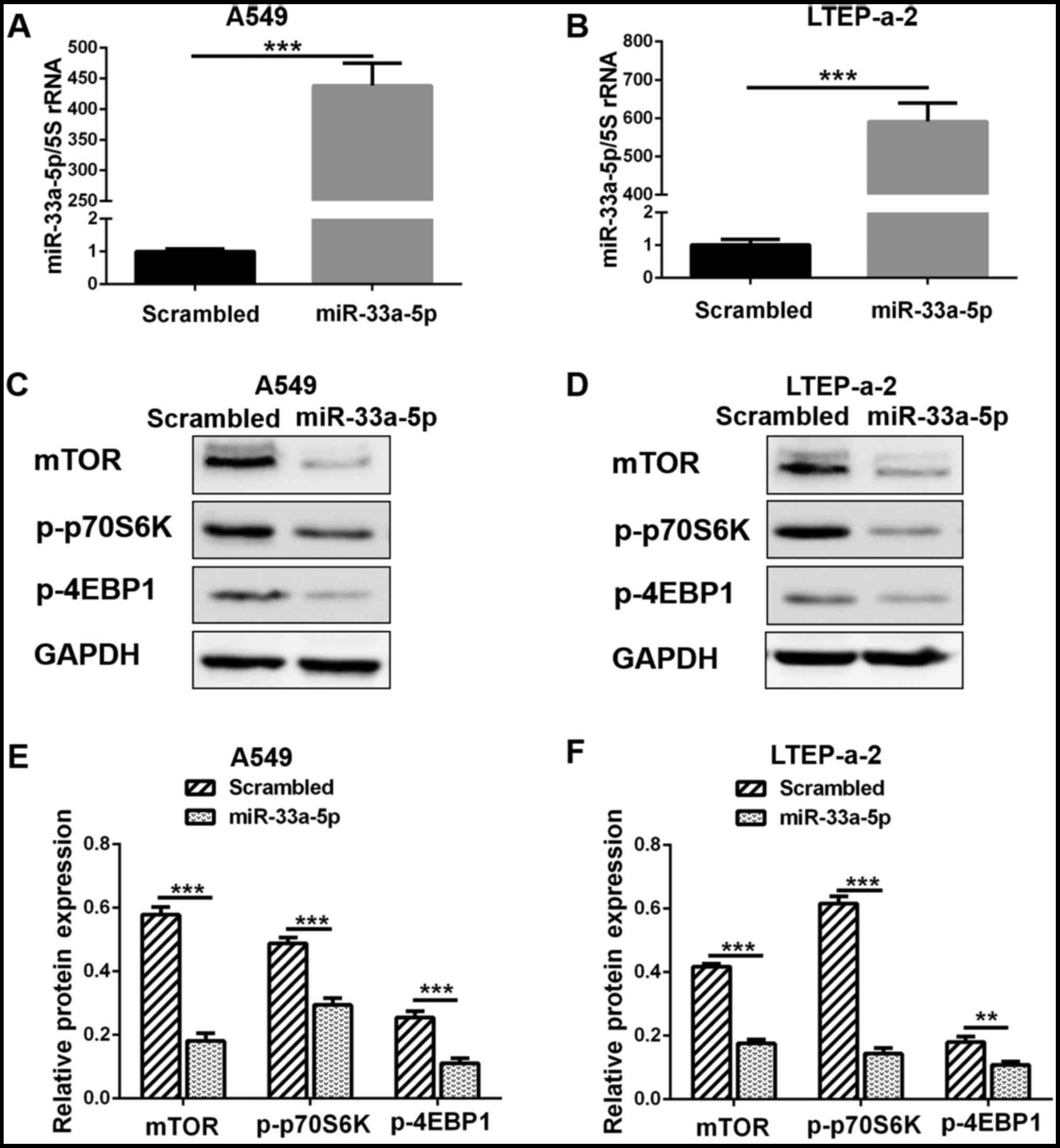 The effect of miR-33a-5p transfection on mTOR expression in lung adenocarcinoma cells was determined. RT-qPCR analysis confirmed that the expression levels of miR-33a-5p significantly increased in the A549 and LTEP-a-2 cells following mimics transfection (Fig. 4A and B). The results from the western blot analysis of the transfected cells indicated that the protein expression levels of mTOR were significantly inhibited following miR-33a-5p overexpression (Fig. 4C–F). Furthermore, the protein expression levels for the downstream effectors of mTOR, p-p70S6K and p-4EBP1, were significantly decreased following miR-33a-5p overexpression (Fig. 4C–F). These results indicated that miR-33a-5p inhibited the proliferation of lung adenocarcinoma cells via the mTOR signaling pathway.