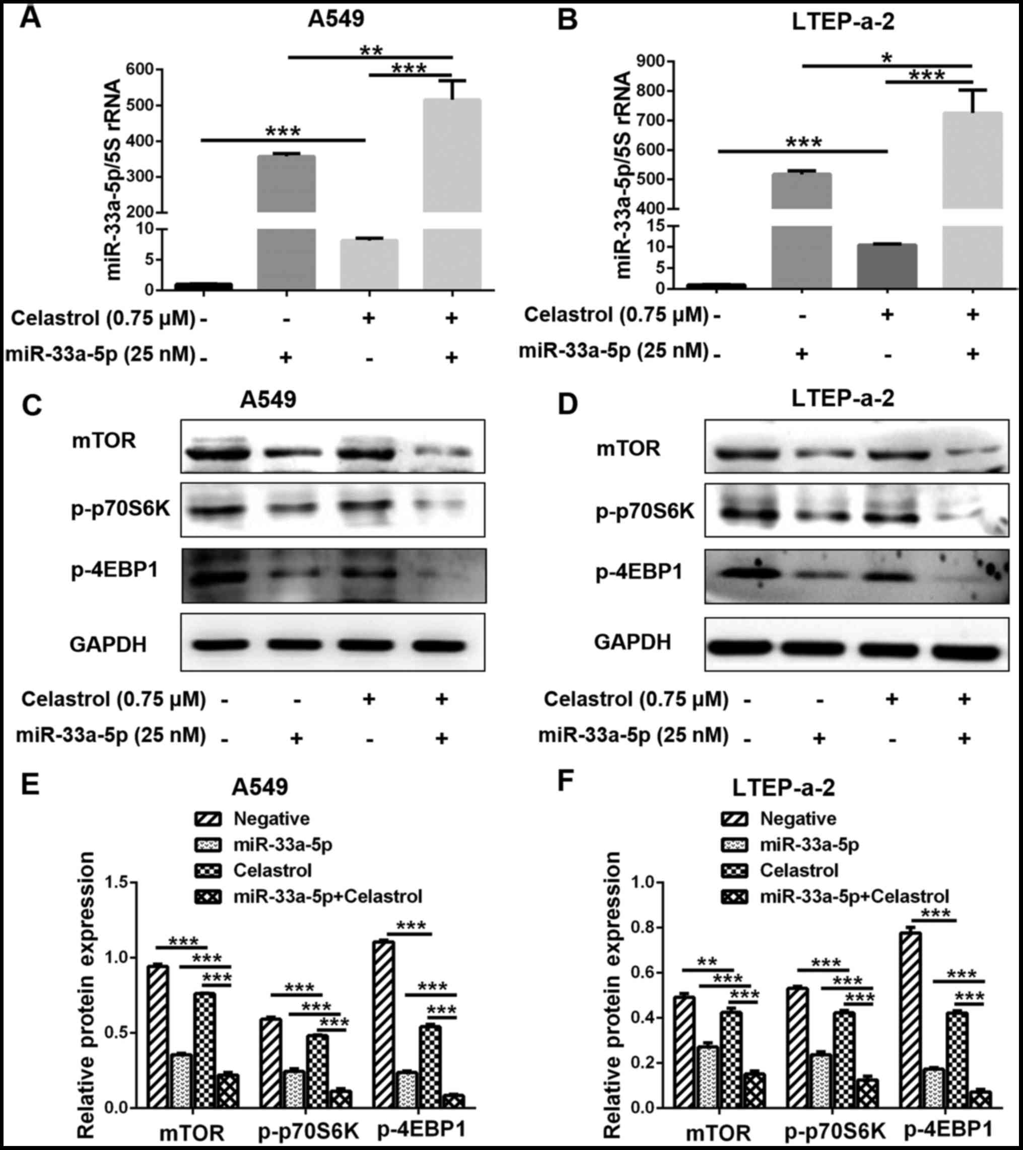 The expression levels of miR-33a-5p were examined by RT-qPCR, in order to explore the mechanism by which miR-33a-5p enhances the sensitivity of lung adenocarcinoma cells to celastrol. Although miR-33a-5p expression was increased in the celastrol alone group, it was considerably higher in the celastrol and miR-33a-5p combination treatment group (Fig. 6A and B). Furthermore, results from western blot analysis demonstrated that the expression of mTOR was markedly decreased in the combination treatment group as the expression of miR-33a-5p increased (Fig. 6D–F). Similarly, p-p70S6K and p-4EBP1 expression was also further decreased in the combination treatment group (Fig. 6D–F). These results suggested that mTOR was involved in the mechanism by which miR-33a-5p enhanced the sensitivity of lung adenocarcinoma cells to celastrol. The results were similar in A549 (Fig. 6C and E) and LTEP-a-2 (Fig. 6D and F) cells.