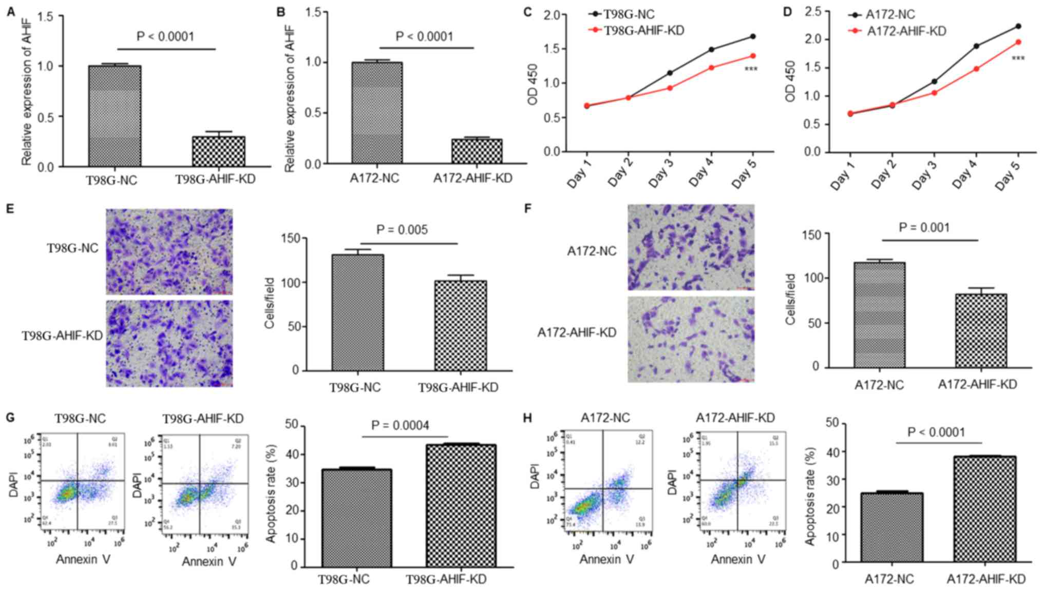 To investigate the function of AHIF in GBM progression and radiotherapy, T98G and A172 cells with stable KD of AHIF were constructed using a lentivirus. As presented in Fig. 2A and B, AHIF was effectively inhibited in AHIF-KD cells compared with in the NC cells. CCK-8 analysis of these cells suggested that the viability of AHIF-KD cells was significantly decreased compared with that of NC cells (Fig. 2C and D). Invasion assay results demonstrated that AHIF-KD cells had a significantly decreased invasive capacity compared with that of NC cells (Fig. 2E and F). Furthermore, an apoptosis assay of AHIF-KD cells following 6-Gy treatment indicated that the proportion of apoptotic cells was significantly increased (Fig. 2G and H). In summary, these results indicate that KD of AHIF in GBM cells decreased the viability and invasive ability, and increased the proportion of apoptotic cells following radiotherapy.