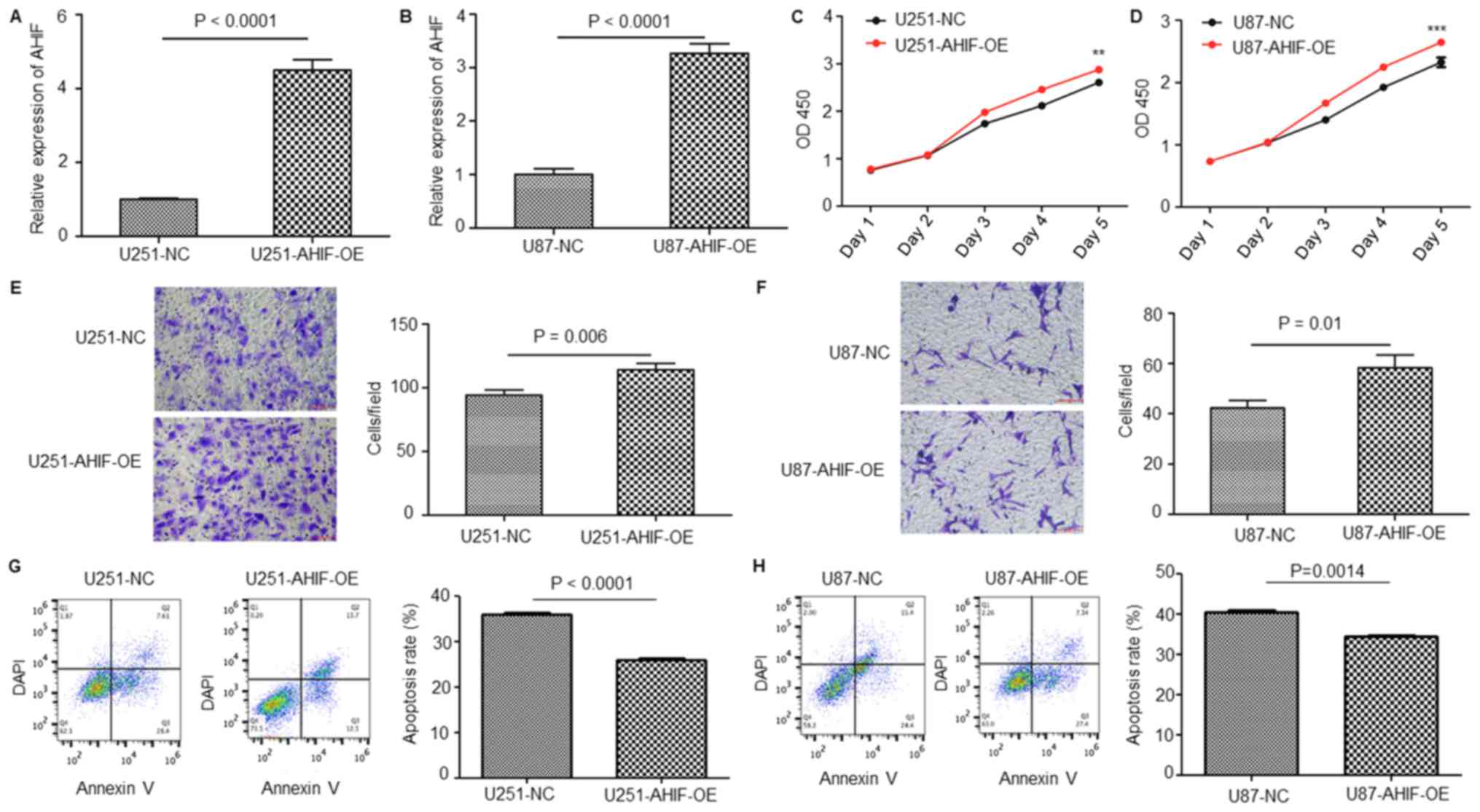 To further clarify the function of AHIF in GBM progression and radiotherapy, GBM cells with stable OE of AHIF were constructed using a lentivirus. As presented in Fig. 3A and B, AHIF was effectively overexpressed in AHIF-OE U87-MG and U251-MG cells compared with in the NC cells. CCK-8 analysis of these cells identified that the viability of AHIF-OE cells was significantly increased compared with that of NC cells (Fig. 3C and D). Invasion assay results demonstrated that OE of AHIF significantly increased the cell invasive ability (Fig. 3E and F). Furthermore, an apoptosis assay of AHIF-OE cells following 6-Gy treatment indicated that the proportion of apoptotic cells was significantly decreased (Fig. 3G and H). In summary, these results indicate that OE of AHIF in GBM cells increased the viability and invasive ability, and decreased the proportion of apoptotic cells following radiotherapy.