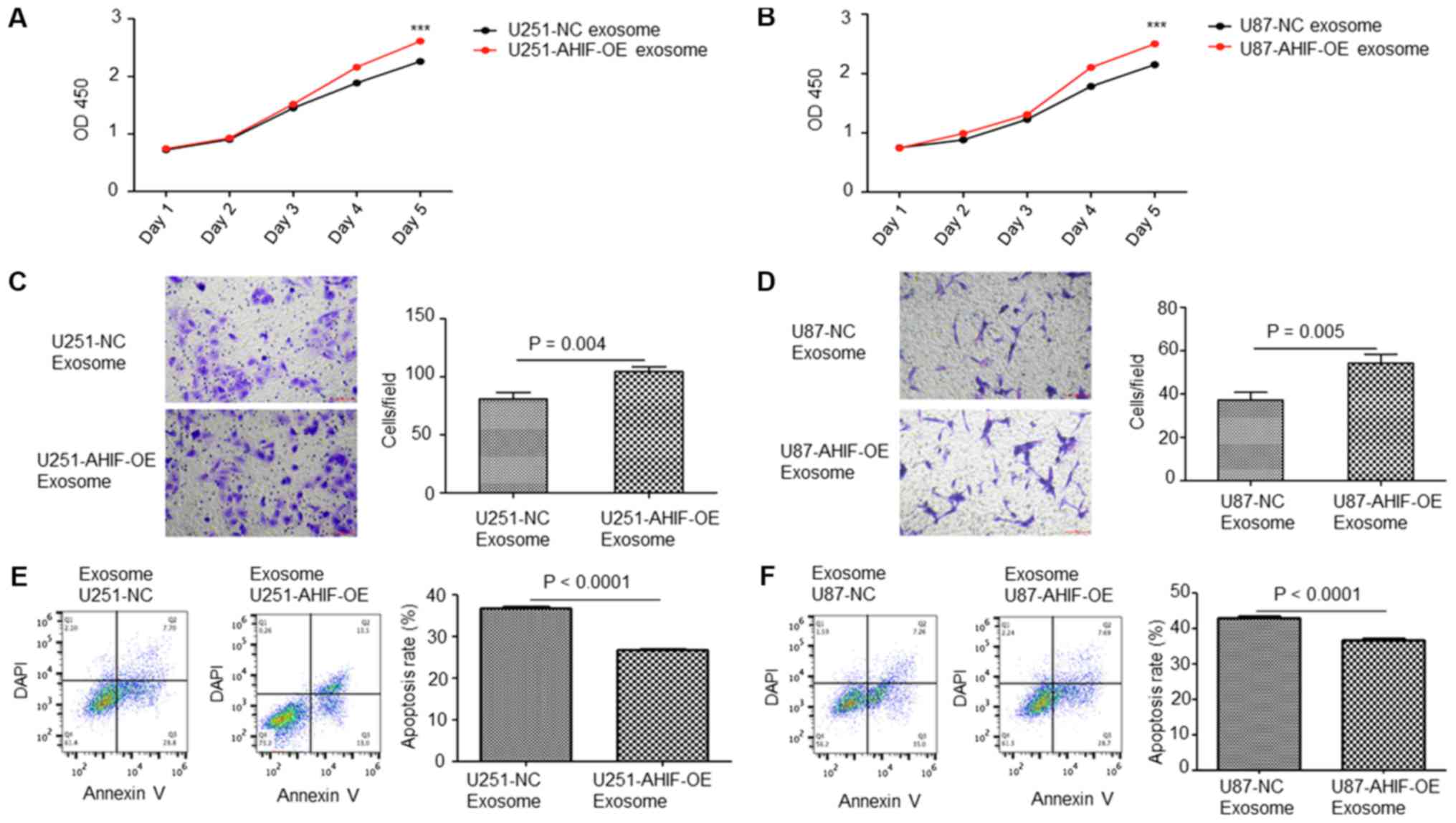 Exosomes were collected from AHIF-OE cells. CCK-8 analysis indicated that the viability of cells co-cultured with exosomes derived from AHIF-OE cells was significantly increased compared with cells treated with exosomes derived from control cells (Fig. 5A and B). Invasion assay results suggested that cells co-cultured with exosomes derived from AHIF-OE cells exhibited significantly increased invasive ability compared with cells treated with exosomes derived from control cells (Fig. 5C and D). Furthermore, an apoptosis assay of these cells following 6-Gy treatment indicated that the cell group co-cultured with exosomes derived from AHIF-OE cells contained a significantly decreased percentage of apoptotic cells compared with the cell group treated with exosomes derived from control cells (Fig. 5E and F). In summary, these results indicate that AHIF-OE GBM cells promoted viability, invasion and radio-resistance via exosomes.
