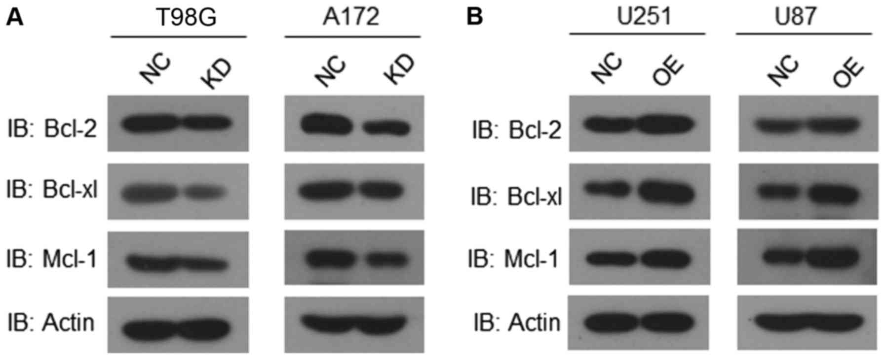 In order to clarify the underlying molecular mechanisms of AHIF in GBM progression and radiotherapy, invasion and angiogenic genes were analyzed in AHIF-KD and AHIF-OE cells. Expression levels of exosomal VEGF and angiogenin were significantly decreased following KD of AHIF (Fig. 6A and B). By contrast, the expression levels of exosomal VEGF and angiogenin were significantly increased following OE of AHIF (Fig. 6C and D). Significantly downregulated HIF-1α expression was observed in AHIF-OE cells (Fig. 6E and F). Furthermore, the expression levels of anti-apoptotic Bcl-2, Bcl-xl and Mcl-1 were analyzed in AHIF-KD, AHIF-OE and control cells. The western blot results indicated that the expression of anti-apoptotic Bcl-2, Bcl-xl and Mcl-1 was decreased in AHIF-KD cells (Fig. 7A). By contrast, the levels of these proteins were increased in AHIF-OE cells (Fig. 7B). These data indicated that AHIF regulates factors associated with invasion and apoptosis.