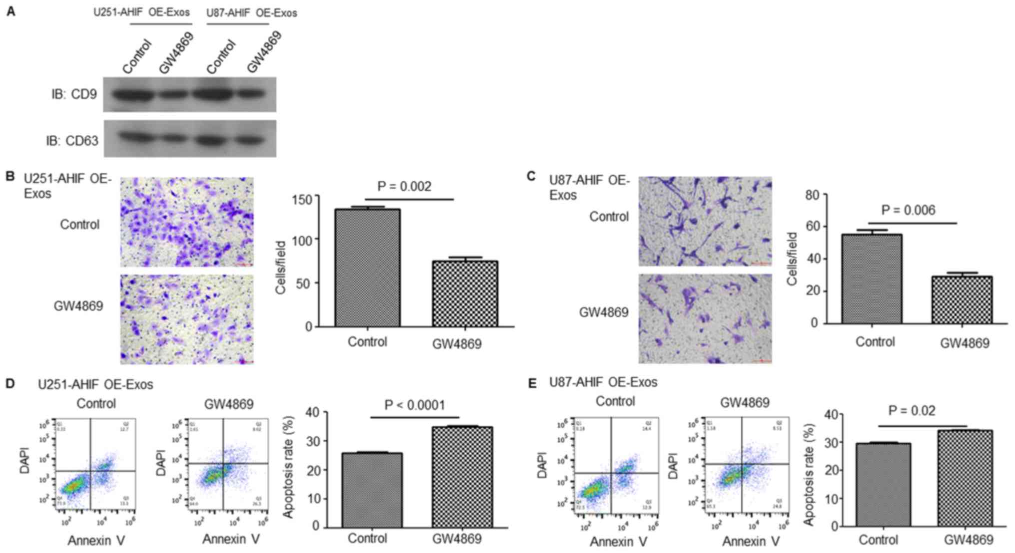 To further verify the function of exosomes in the effect of AHIF expression on GBM cells, exosome generation was blocked with the exosomal release inhibitor GW4869 (31,32). As presented in Fig. 8A, exosome release was effectively suppressed following GW4869 treatment. Invasion assay results indicated that GW4869 significantly decreased GBM cell invasion induced by exosomes derived from AHIF-OE cells (Fig. 8B and C). Furthermore, the apoptosis assay indicated that GW4869 treatment significantly inhibited the cell survival ability induced by exosomes derived from AHIF-OE cells (Fig. 8D and E). These results provided further evidence that AHIF promotes the invasive and anti-apoptosis abilities of GBM cells via exosomes.