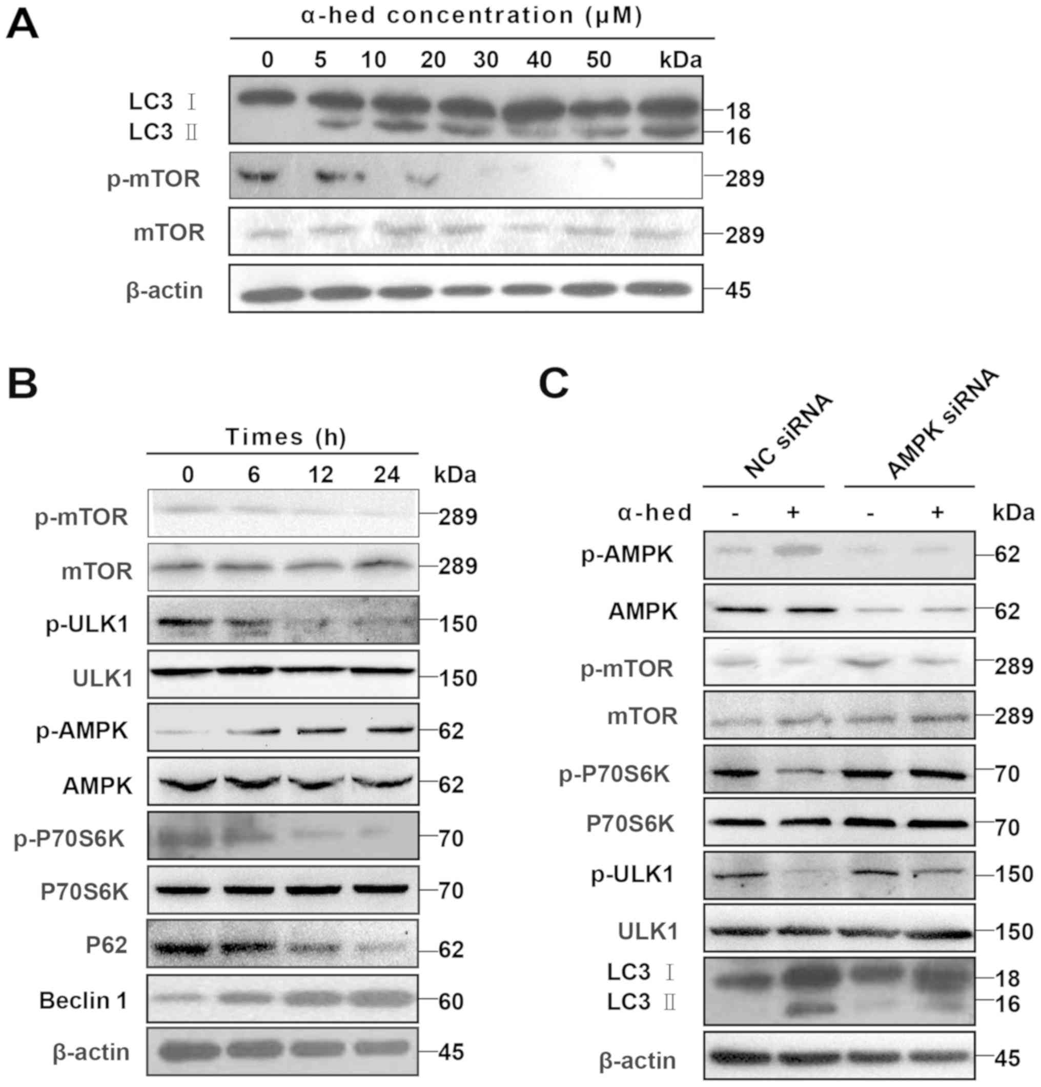 Given that dephosphorylation of p-mTOR and degradation of LC3 I to LC3 II are the major mechanisms involved in autophagy (40), LC3 II protein levels were used to determine the extent of cell autophagy (41). After treating HCT116 cells with α-hederin for 24 h, cell lysates were used to detect p-mTOR and LC3 II protein levels. As presented in Fig. 5A, an increase in α-hederin concentration resulted in a gradual increase in LC3 II levels but a gradual decrease in p-mTOR protein levels. HCT116 cells were also treated with 10 µM α-hederin for 6, 12 and 24 h. The results demonstrated that, over time, α-hederin caused a gradual decrease in p-mTOR, p-ULK1, p-P70S6K and P62 protein levels but a gradual increase in p-AMPK and beclin-1 protein levels (Fig. 5B).