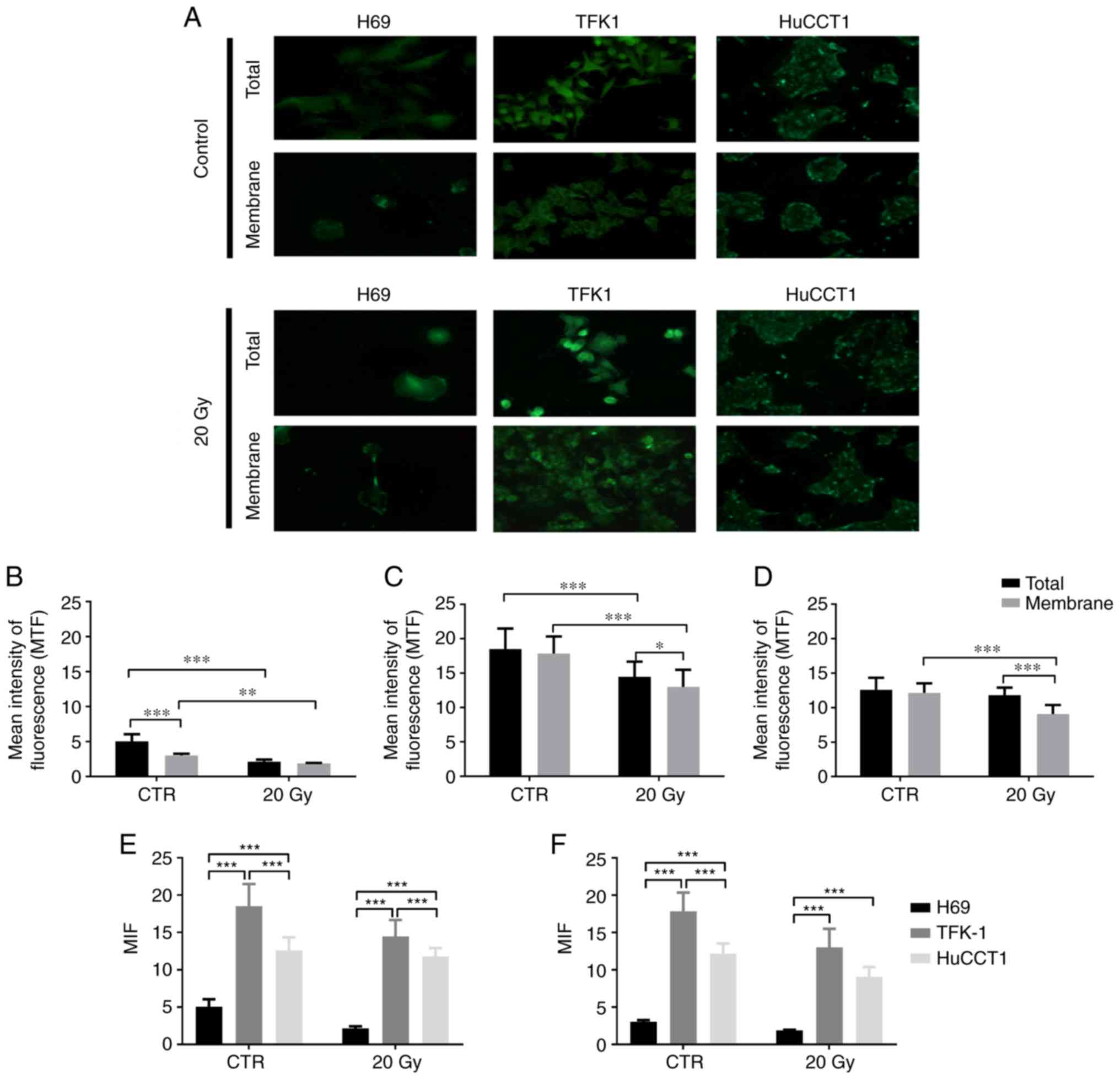As shown in Fig. 1A, the TFK-1 and HuCCTl CC cells exhibited a higher NIS expression compared to the cholangiocytes. MIF quantification revealed that NIS expression was cell line-dependent. In the cholangiocytes (H69 cells, Fig. 1B), in the controls, total NIS expression was significantly higher than membrane expression (5.05±0.99 vs. 3.03±0.24; P<0.001). The total NIS expression in the controls was also significantly higher than the total expression following exposure to 20 Gy of 131I (2.13±0.30; P<0.001). Moreover, the membrane expression in the control cells was significantly higher compared to the membrane expression following exposure to 131I (1.88±0.06, P=0.002).