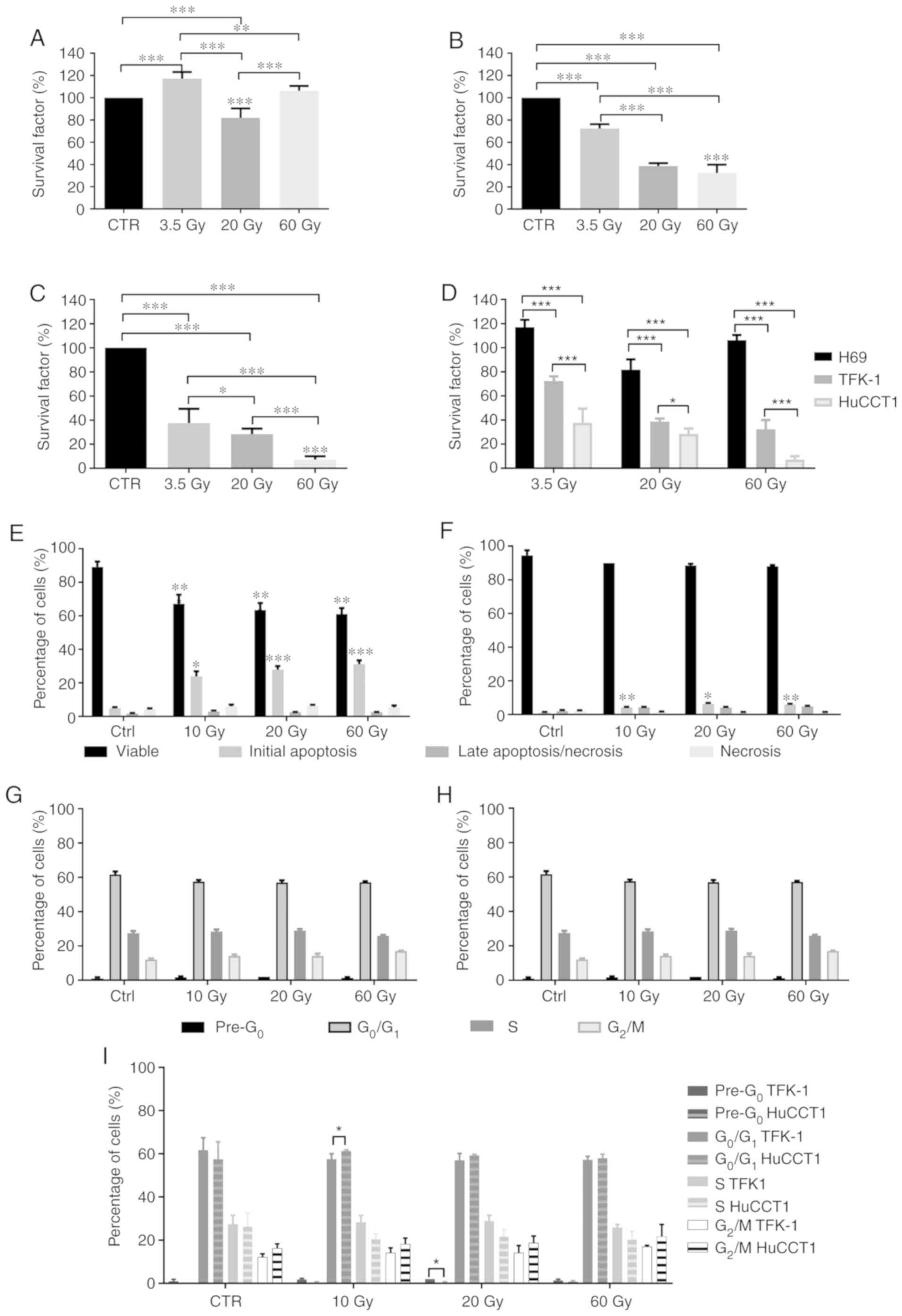 We evaluated cell viability and the type of cell death following irradiation with 131I by Annexin V-FITC and propidium iodide double labeling. The results (Fig. 2E and F) revealed that cell viability and the type of cell death were highly dependent on the cell line and irradiation dose. In the TFK-1 cells (Fig. 2E), irradiation induced a significant decrease in cell viability following irradiation with 10 Gy (67.17±5.42%; P<0.001), 20 Gy (63.50±4.09%; P<0.001) and 60 Gy (61.00±3.63%; P<0.001), compared to the controls (89.17±3.19%). The decreased cell viability was due to the increased percentage of cells in initial apoptosis following radiation with 10 Gy (23.83±7.57%; P=0.013), 20 Gy (27.83±5.31%; P<0.001) and 60 Gy (31.17±5.56%; P<0.001), compared to the controls (4.83±1.83%). No significant alterations in cells undergoing cell death by late apoptosis/necrosis and necrosis were observed following irradiation, compared to the controls.