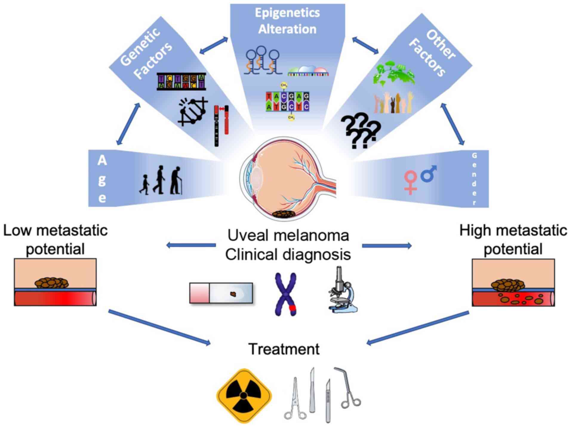 Genetic and epigenetic characteristics of tumors have been given ever-increasing attention over the past years, not only due to their relevant role in the carcinogenesis process, but also as they can provide new insight into tumor behavior (168). This can potentially allow the development of reliable biomarkers and novel therapeutic targets, leading to new breakthroughs in the management of UM. Genetic alterations affect directly and permanently the DNA sequence and include the following: Chromosomal aberration, copy number variation (CNV), mutations either somatic or germline and single nucleotide polymorphism (SNP). Conversely, epigenetic alterations modulate gene activity and expression without involving any changes in the DNA sequence; these include the alteration of microRNA (miRNA/miR) expression levels, DNA methylation and histone modifications (168). The interaction between genetic, epigenetic and other possible factors involved in UM carcinogenesis is illustrated in Fig. 1.