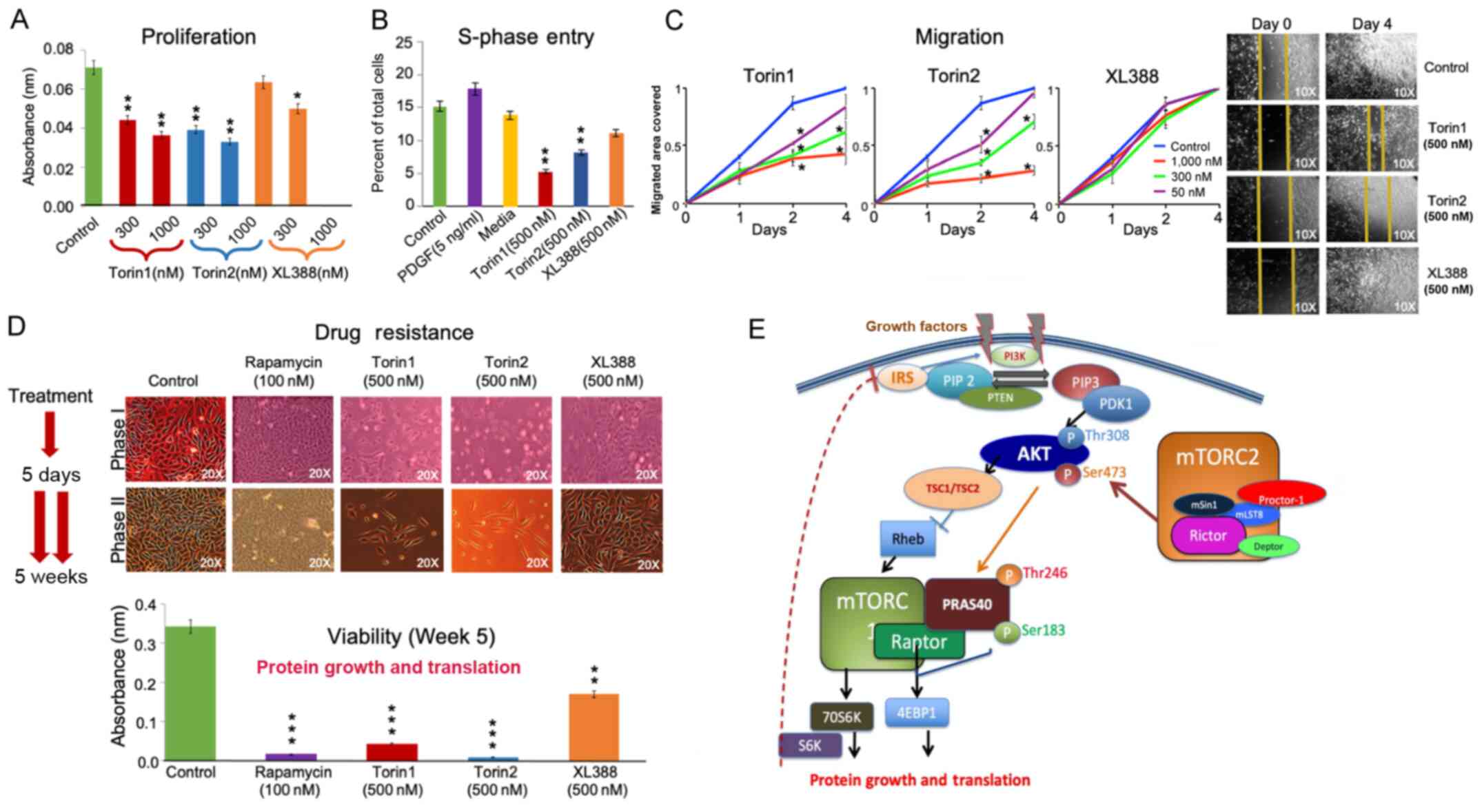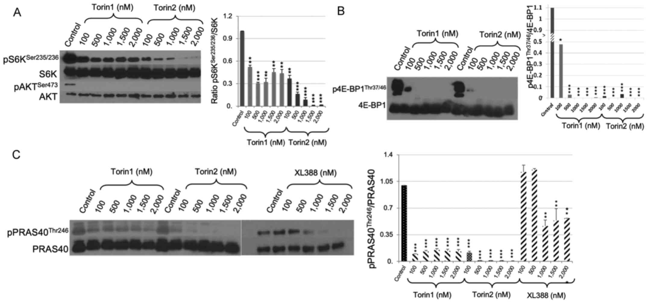 The results of the present study clearly demonstrated that the dual inhibitors of mTORC1 and mTORC2, Torin1 and Torin2, effectively suppressed both complexes. These inhibitors suppressed the phosphorylation of mTORC1 substrate 4E-BP1 and PRAS40 in a dose-dependent manner. Whereas Torin2 abolished the phosphorylation of mTORC1 substrate 4E-BP1 and PRAS40, Torin1 and Torin2 suppressed phosphorylation of AKTSer473. These results also showed that the ATP-binding inhibitor XL-388 reduced the activation of mTORC1 substrate only at higher doses. Torin1 and Torin2 were more effective in suppressing GB cell proliferation as well as S-phase entry. Cell migration was suppressed by Torin1 and Torin2, but not by XL-388. Both rapamycin- and Torin1 treated cells showed marked suppression of cell growth in drug-resistance analyses, but Torin2 completely eradicated the GB cell populations. GB cells showed partial drug resistance to XL388 treatment. Torin 1, Torin2 and XL388 showed highly specific inhibition of mTORC1 and mTORC2. GB cell proliferation and migration was suppressed by Torin2, which effectively inhibited both mTORC1 and mTORC2.