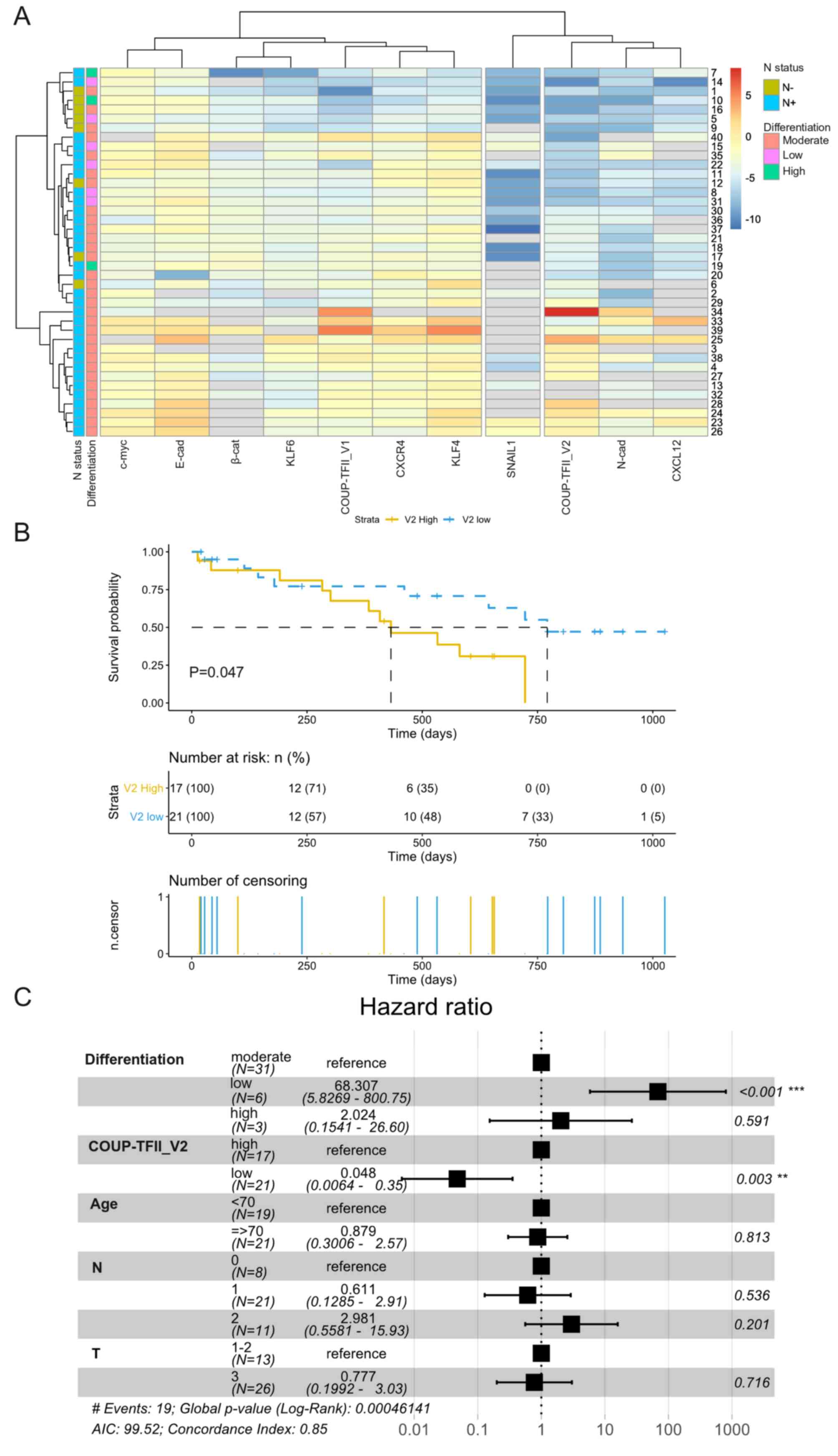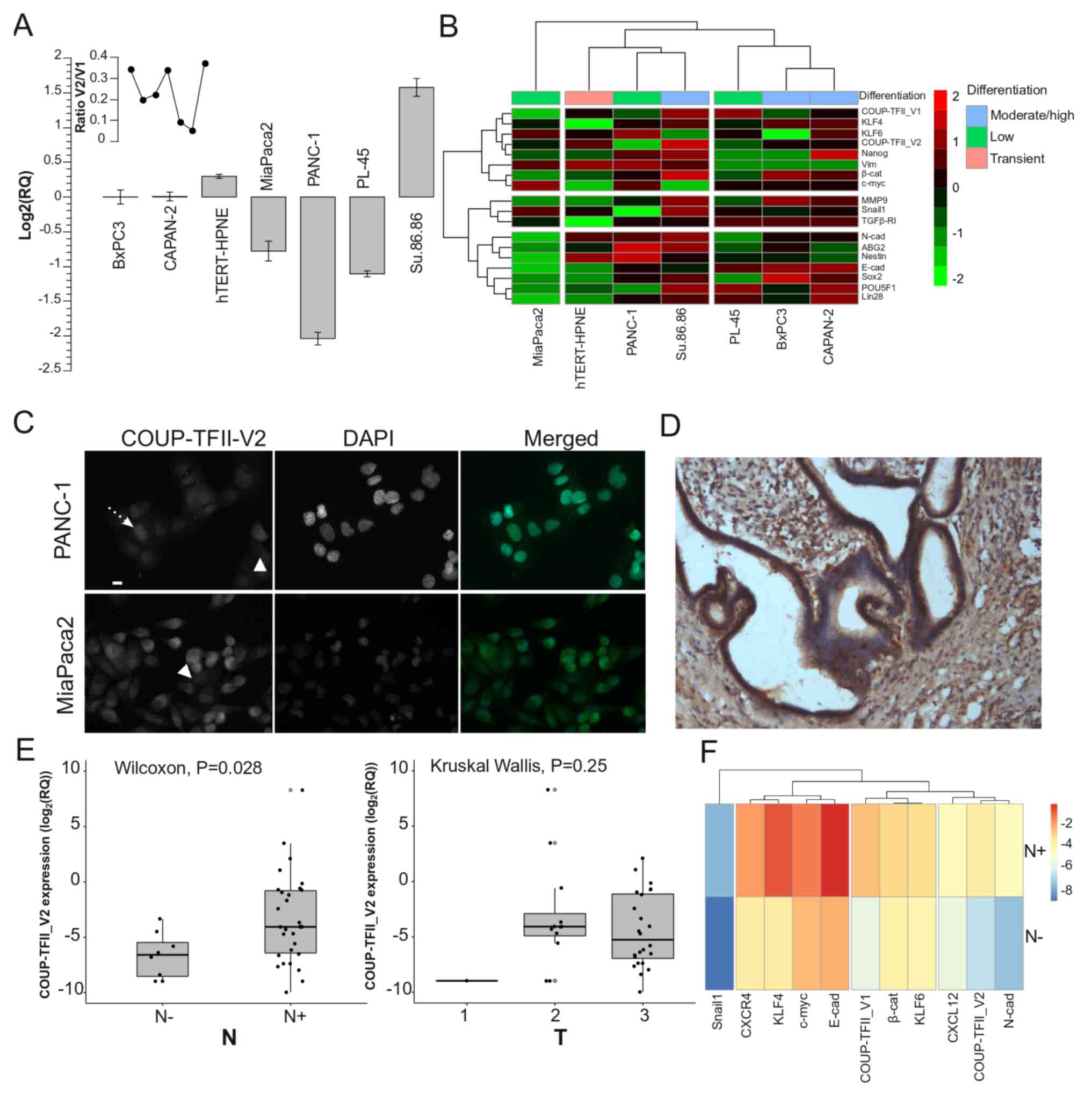 As a previously published study by our group indicated that human PDAC cells express COUP-TFII_V1 (18), the present study sought to demonstrate the expression of COUP-TFII_V2 in human PDAC cells. As presented in Fig. 1A, COUP-TFII_V2 mRNA was detectable in all tested PDAC cell lines (from the well-differentiated and K-RAS wild-type BxPC3 to the poorly differentiated PANC-1). The expression was lower in PANC-1 and higher in Su.86.86 cells. Gene clustering suggested that COUP-TFII_V1 and COUP-TFII_V2 share expression patterns similar to Kruppel-like factor (KLF)4, KLF6 and NANOG (Fig. 1B), while the PCA-biplot indicated a correlation of COUP-TFII_V1 and V2 with SNAIL1; furthermore, PCA suggested that the receptors are a characterizing factor of the metastatic cell line Su.86.86 (Fig. S2A). These data suggest that both isoforms are associated with stemness and metastatic potential. Of note, COUP-TFII_V2 expression was not limited to the nucleus but spanned to the cytosol (Figs. 1C and S2B-D), whereas V1 was strictly nuclear-specific (Fig. S2E) (5,18). Furthermore, COUP-TFII_V2 localization exhibited cell-to-cell variation, having a stronger cytoplasmic expression in certain cells (Figs. 1C and S2B). In primary tumors, COUP-TFII_V2 was expressed in the cancer cells (Figs. 1D and S3A-H) and its mRNA expression was predictive of advanced disease (Table I). Specifically, COUP-TFII_V2 expression was significantly higher in patients with lymph node metastasis (Figs. 1E and S3I), suggesting that this nuclear receptor may be associated with tumor spreading. No specific associations with age, sex or other clinicopathological characteristics were observed (Table I). When confronting the average gene expression between N0 and N+ patients, the hierarchical clustering indicated a close association of COUP-TFII_V2 with N-cadherin and C-X-C motif chemokine ligand (CXCL)12, while COUP-TFII_V1 was linked to β-catenin and KLF4 (Fig. 1F). Considering each PDAC patient separately, V1 was associated with the expression of CXCR4 and KLF4, whereas V2 was associated with CXCL12 and N-cadherin (Fig. 2A); similar results were obtained with a correlation analysis of gene expression (Fig. S4). Kaplan-Meier survival analysis indicated that patients with high expression of COUP-TFII_V2 had a significantly shorter overall survival (432 vs. 771 days, P=0.047) (Fig. 2B) and Cox multivariate analysis demonstrated that patients with low expression of COUP-TFII_V2 or a higher degree of differentiation had a lower hazard ratio (Fig. 2C), confirming the results of the Cox univariate analysis (Table SV). The influence of clinical parameters on the survival in the study population is provided in Fig. S5.