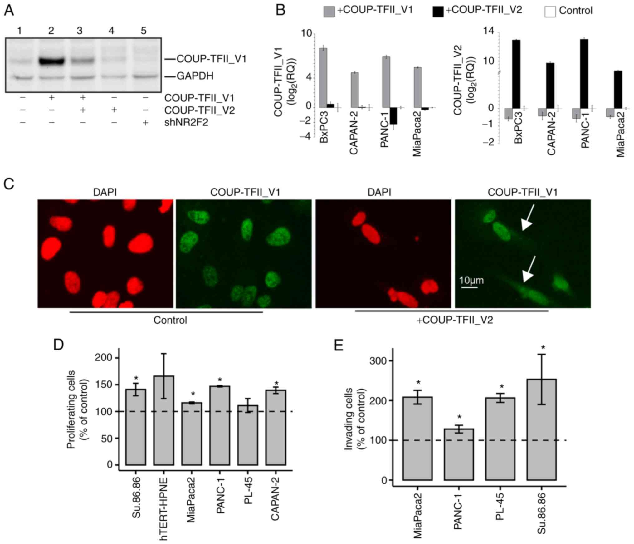 Pancreatic cell lines (PANC-1, BxPC3, CAPAN-2, MiaPaca2, hTERT-HPNE, PL-45 and Su.86.86) were obtained from the American Tissue Type Collection and cultured as previously described (18). Specifically, PANC-1, MiaPaca2,CAPAN-2 and PL-45 were cultured in DMEM high glucose (MilliporeSigma) with 10% Fetal Bovine Serum (FBS; Euroclone); Su.86.86 and BxPC3 cells were cultured in RPMI-1640 (MilliporeSigma)/10% FBS; hTERT-HPNE were cultured in 75% DMEM (MilliporeSigma) (with 2 mM L-glu and 1.5 g/l sodium bicarbonate, both from MilloporeSigma)/25% Medium M3 Base (Incell Corp.) with 5% FBS, 10 ng/ml human recombinant EGF (Thermo Fisher Scientific, Inc.), 5.5 mM D-glucose (1 g/l; MilliporeSigma) and 750 ng/ml puromycin (Thermo Fisher Scientific, Inc.). The transfections of plasmids were performed with FuGENE HD (Promega Corporation) according to the manufacturer's protocol. Short hairpin (sh)RNA for COUP-TFII (shNR2F2) and negative control shRNA (shNEG) are described in (18); shNR2F2 covers the same target sequence of a small interfering (si)RNA for COUP-TFII (Hs_NR2F2_6, cat. no. s103649065; Qiagen GmbH). COUP-TFII_V2-GFP (cat. no. RG226609) and COUP-TFII_V2 (cat. no. 4453629) plasmids were from OriGene Technologies, Inc.